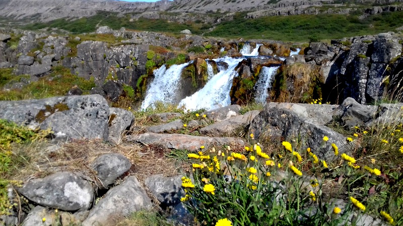 Après cette première exploration, après une halte à Bíldudalur pour acheter des chaussettes à une dame qui les tricote sur son perron et après une longue attente d’une heure pour trouver le prochain compagnon de mes serpentes islandaises, les West Fjords ne sont qu’une succession de panoramas époustouflants et de couleurs hypnotisantes, dont notamment une belle escale le long des chutes d’eau de Dyjandi.