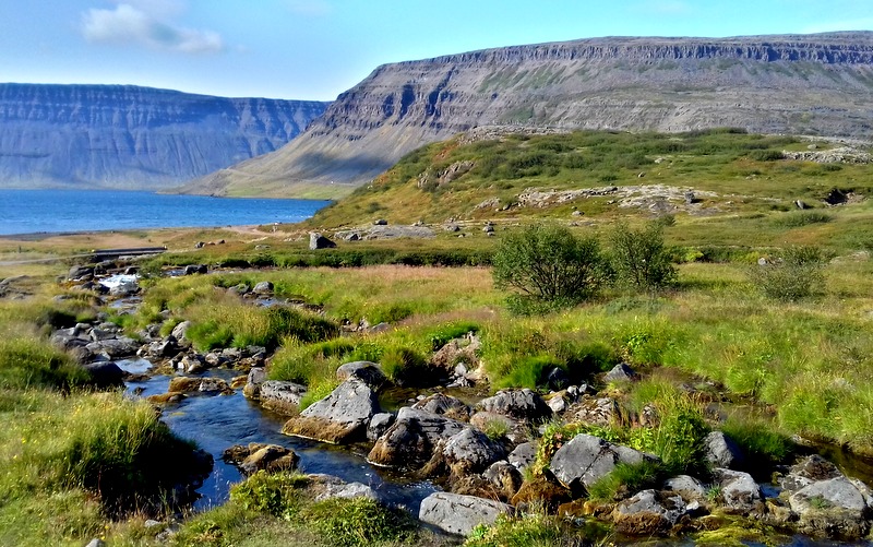 Puis, il est temps pour moi de redescendre vers Reykjavik pour être sûre de pouvoir prendre mon avion dans deux jours. Je serpente l’autre côté des West Fjords qui rapetissent au fur et à mesure que l’on s’éloigne du Pôle, mais pas suffisamment pour ne pas garder de leur prestance. Je fais halte au camping de Laugar pour la nuit : même s’il est le point de départ de quelques ballades en montagne, je ne le recommande pas vraiment car il faut payer un supplément pour avoir accès à la douche (ça n’est pas très cher 1200 + 700 ISK / 14 € total, mais c’est plus pour le principe…).