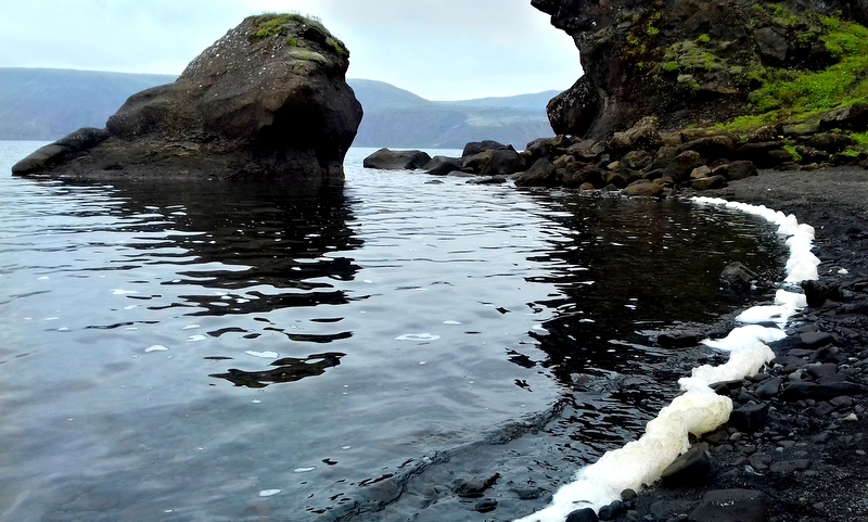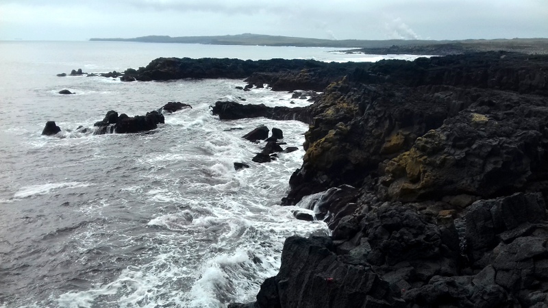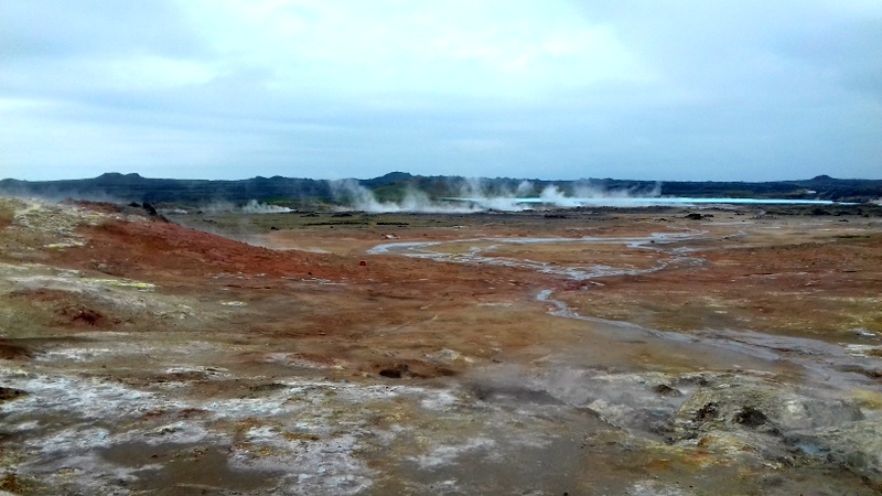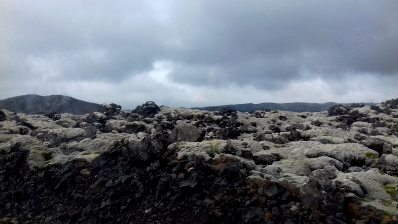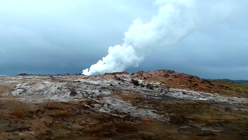 Le matin est brumeux, comme le soleil couchant d’hier, et la péninsule noire de Reykjanes se languit de mes découvertes. Je commence par l’immensité du lac de Kleifarvtn, lisse et bleu marine du ciel gris, je me sens si minuscule en haut de la butte volcanique qui devrait ouvrir mon regard sur l’océan si le ciel n’était pas brouillageux. Je fais le tour et les détours du lac où les rochers s’érigent en tête de Sioux, où les grottes se creusent petit à petit mais de plus en plus grandes, où les monts m’encerclent en dents de scie. Je m’attarde à la marmite boueuse fumante et grondante, qui pourrait me défigurer d’un éclat de boue et je contemple les rides dont sa fournaise craquelle la terre.