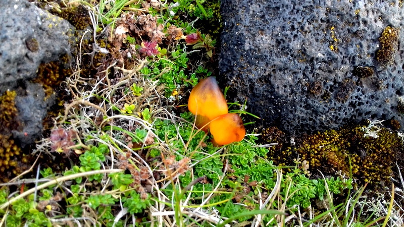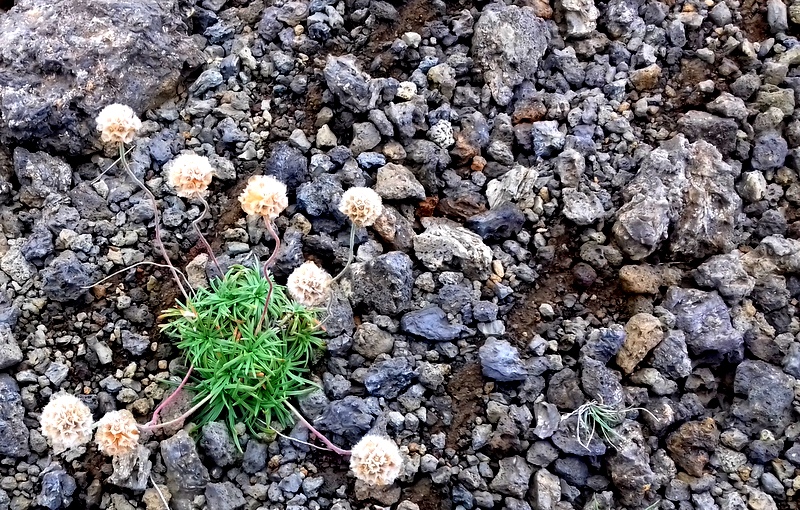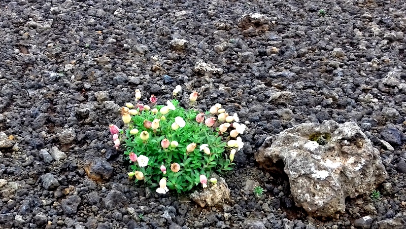 J’arpente les fureurs des volcans dont la lave n’a laissé que des landes creusées et désolées, dérangées dans leur désordre noir par quelques graines éparpillées au hasard des vents contraires pour y déposer des fleurs que l’on n’appelle pas combattantes mais qui en ont pourtant la nature. Ainsi, trois bourgeons resplendissent enhardies de leurs racines caverneuses. La nature, même au milieu de la terre la plus inhospitalière, trouve toujours son chemin et flamboie.