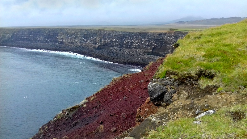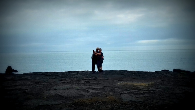 A un moment de la journée, n’importe quel moment puisque les heures ne savent pas compter au plus près des pôles, je m’arrête auprès du plateau de Valahnúkamöl suspendu au-dessus de la mer . J’imagine les gens qui se tenaient peut-être ici, sur ce même morceau vertigineux, chacun d’un côté des continents au moment de la rupture de Pangée, le cœur et la main tendus l’un vers l’autre comme dans une ultime tentative de préserver le monde qu’ils avaient toujours connus. Mon imagination se laisse nourrir par un petit couple de vieux – il porte ses bretelles de 1940 et son béret assorti à ses baskets dernier cri, elle a mis sa belle robe noire et ses chaussures de marche – qui s’aiment comme au premier jour et l’immortalisent par un selfie qu’ils enverront certainement à leur famille infinie.