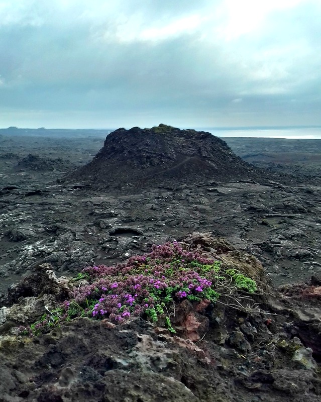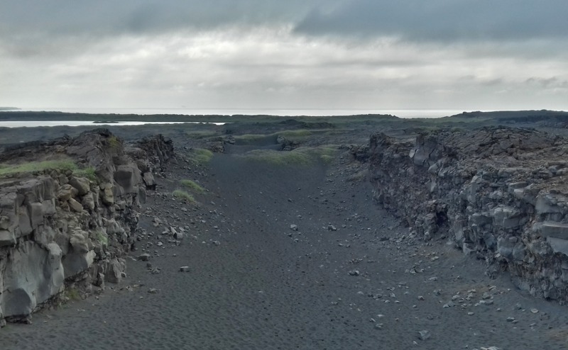 Puis je vagabonde furtivement au cœur de l’un des cratères de Stampar qui servait jadis de repères aux pécheurs en mer, et s’élève aujourd’hui érodé par les ans dans le désert noir cousin de la lune. Ma journée s’achève, riche et fatiguée, sur la rupture des mondes à Miðlína dont le pont se fend de promesses d’amour en regardant l’océan.