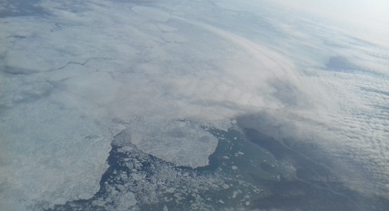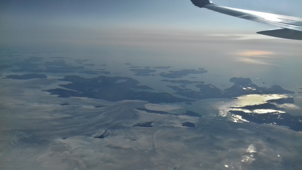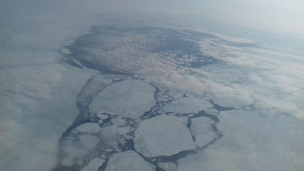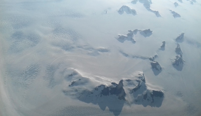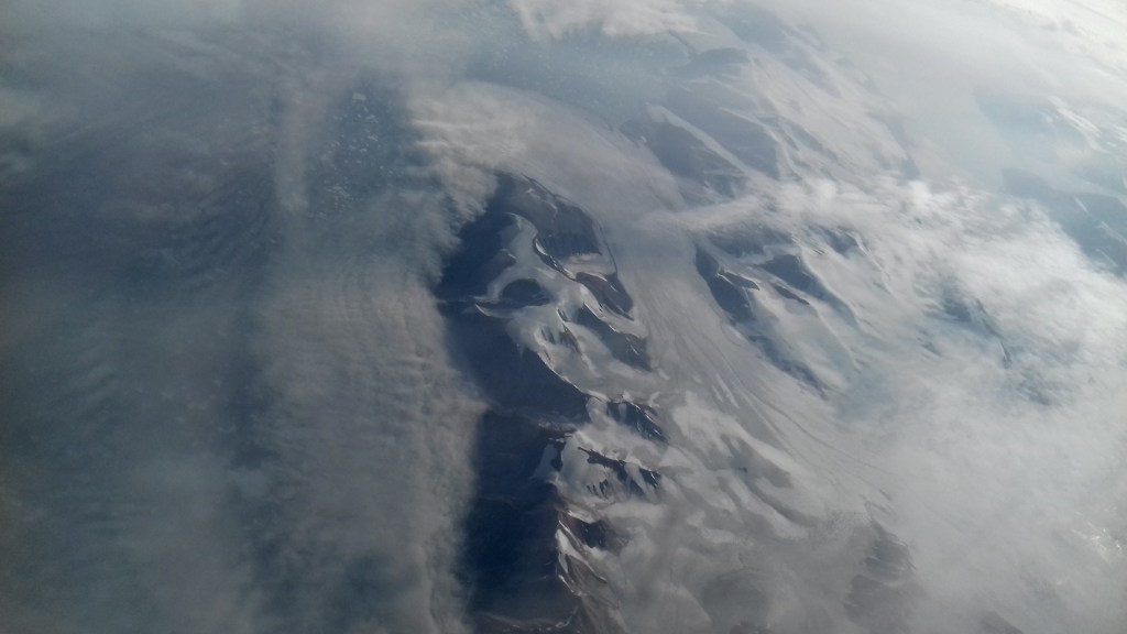 Lorsque je m’envole enfin au plus près des Pôles, c’est absolument magique de survoler le Grand Nord. Je suis totalement bouleversée par la beauté de la terre et de la mer aux multiples nuances de blancs vues du ciel. Lorsque l’on observe, depuis nos racines mouvantes, les avions danser avec les nuages, l’on n’imagine pas que les hublots peuvent nous voir… et pourtant, quelle histoire doivent-ils se raconter ! Je regarde ainsi passer le désert gris du Groenland, j’écoute le chant des glaciers qui crépitent dans la mer, je dévore les montagnes à la fois tranchantes et tendres, saupoudrées d’une neige qui ressemble à du sucre glace. Je m’hypnotise de cette neige polaire qui renferme les origines de la Terre, presque noire depuis tous ces millénaires.