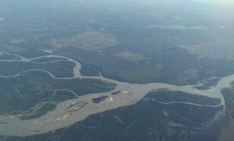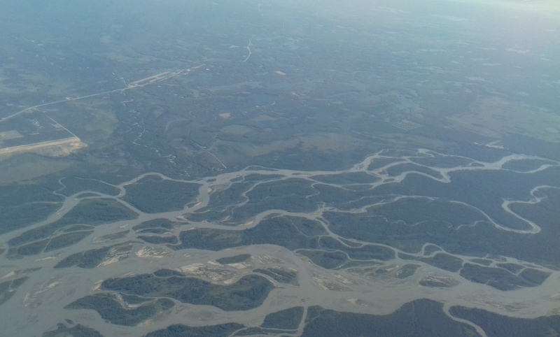 Puis, je contemple l’Alaska pour la première fois, subjuguée, je survole les chaînes de montagne qui dégringole vers Anchorage en suivant la ligne de Denali, j’aperçois le paysage verdir au fil des rivières immenses et brunes. Mon cœur tambourine de la magie hypnotique du pôle, mon cœur caracole de ce qui attend mon présent en Alaska.