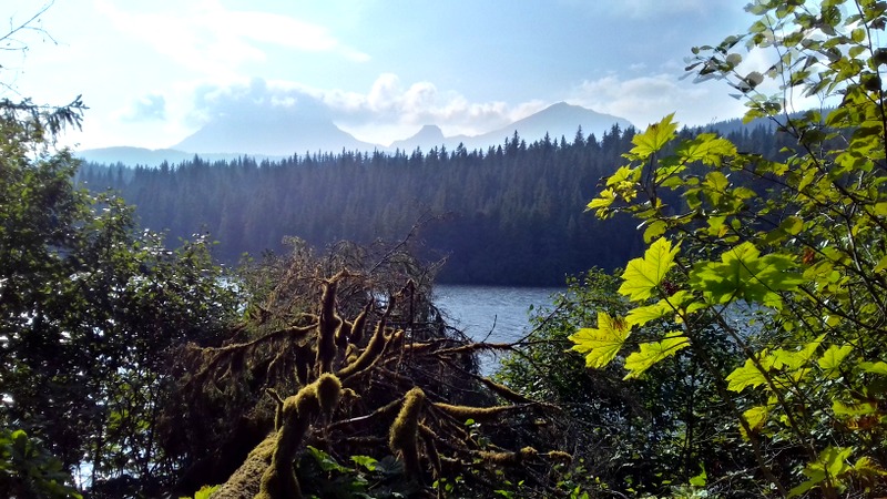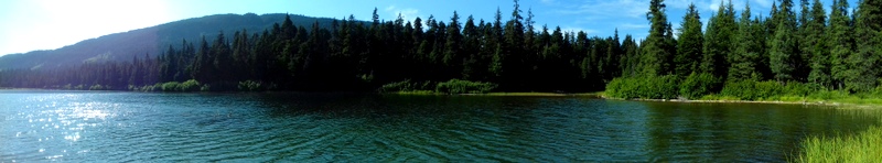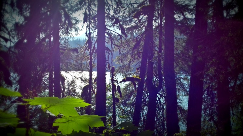 Au matin du deuxième jour, j’adopte mon rythme de la péninsule sans préambule, travaillant le matin et randonnant l’après-midi. Nous commençons en douceur, tous ensemble au son de la cloche anti-ours, une promenade sous les arbres pas tout à fait gigantesques mais déjà bien grands entre les branches desquels se dessinent les pics tranchants et parfois blancs de la chaîne montagneuse alentour. Le lac Grayling est paisible et brillant sous le soleil épineux de la forêt de pins, l’eau translucide et lisse appelle nos corps échauffés par la marche au chant des libellules en voyage. C’est bienveillant et heureux. Simple. Evident. C’est une magie d’un instant. Voisins, étrangers ou amis, tous à nos méditations sur les bonheurs fugaces, silencieux au clapotis de l’eau. L’un fait la planche sur le dos, l’autre prélasse ses pieds sur la rive et son corps sur les pierres. Et nous reprenons la marche, rafraîchis et toujours un peu sonnés de cet enchantement instantané. On en veut plus et l’on s’enchante d’une autre magie sur les berges de Meridian Lake. Son vert hypnotique de nénuphars est tout aussi saisissant que le calme transparent de son lac voisin.