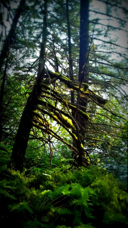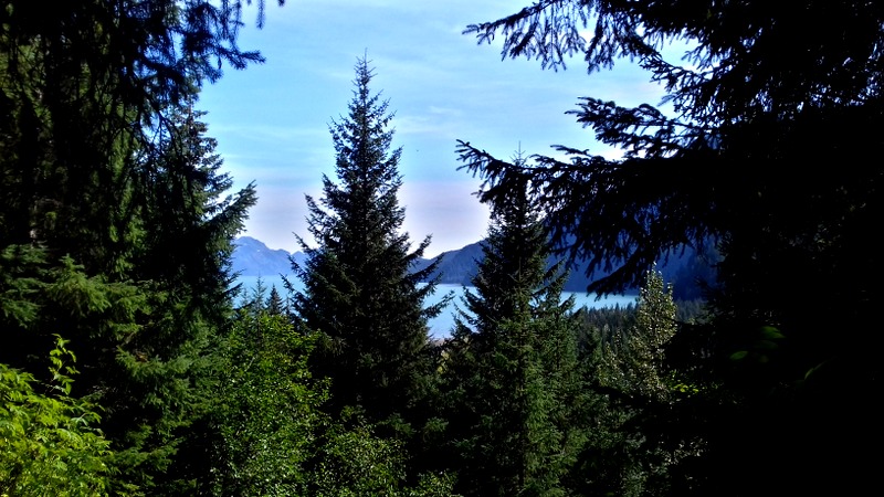 Je me réveille pour mon troisième matin à Seward, sous un ciel non plus grisé mais enfumé. Mon pressentiment à Anchorage était juste, l’Alaska connaît depuis le début de l’été un flot continu de feux de forêts dont les fumées s’attisent au gré des vents. Ainsi, aujourd’hui, la randonnée prévue aux abords du glacier voisin devra attendre un climat plus clair. J’ai trop connu de paysages invisibles, par les fumées ou les brouillards, pour ne pas choisir mes moments quand j’en ai le temps. A une excursion épique et chaude, je préfère donc un sentier ombragé au départ de Lowell Point pour rejoindre Tonsina Creek. Je suis alors prise de la même sensation qu’il y a deux ans devant la nature vierge qui m’entoure, transformée par l’émotion profonde de m’abriter d’une nature intacte. Et c’est curieux car c’est aussi cela qui m’a émue en Islande, cependant de façon complètement différente, alors qu’elle-même m’a interpellée d’une autre façon que l’Irlande et que toutes ces terres ont ce dénominateur commun et bouleversant d’une nature brute et renversante. En Irlande, je m’impressionne de tant de grandeurs contenues dans une si petit écrin, de toute les mémoires de l’humanité qui jalonnent les chemins, ruines d’un autre temps sans jamais être totalement remplacées, aujourd’hui inextricablement imprégnées de la nature environnante. En Islande, je me suis fascinée du caractère extrême et inhospitalier de tout ce que je contemplais, la nature est indomptée, inchangée parce que l’homme n’a eu d’autre choix que de la laisser à son essence pure et glacée. En Amérique, surtout à l’Ouest, surtout sur cette dernière frontière, c’est encore une autre émotion. Je sais que cette terre a été foulée par le pied humain depuis que certains Eurasiens ont traversé le couloir de Bering il y a fort fort longtemps, mais aujourd’hui ne restent de toutes ces civilisations passées que le vent gracile chargé de leurs âmes échappées. Et lorsque je traverse ces arbres millénaires longée par les ruisseaux de pierres sèches ou bien les torrents où les saumons si rouges parce que leur heure est bientôt venue sont venus mourir, c’est comme si je pouvais entendre les esprits de la forêt communiquer entre eux… Émerveillée par leurs secrets indicibles, j’atteins les rives de Tonsina Point, sa plage bleue perle si facilement coupée dans son élan par les montagnes du Fjord et je me délasse là pour un instant. Saisie par un monde si grand que mon cœur n’a pas la force d’exploser.