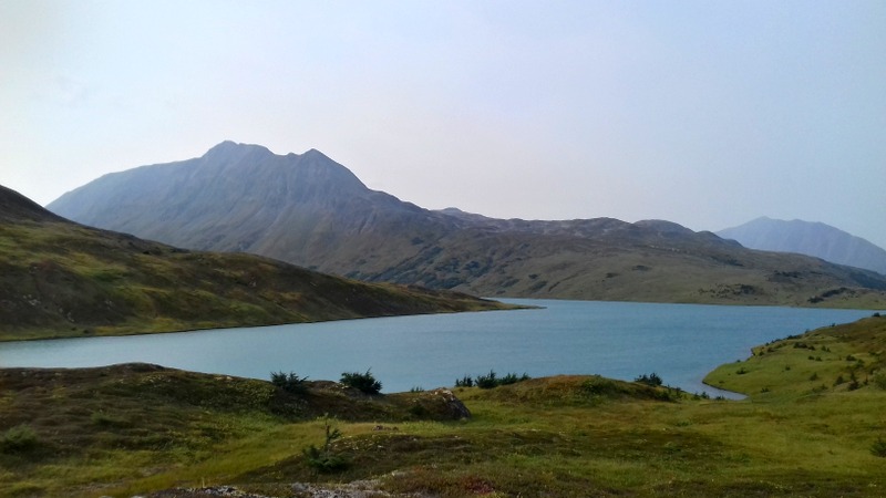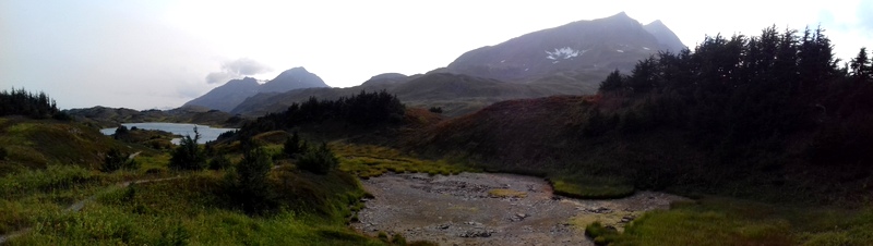 J’ai une pensée pour Ennis au matin du 19 et, après une nouvelle matinée productive – les feux de forêt bloquent l’accès vers Homer, les voyageurs se sont donc réfugiés à Seward -, l’Exit Glacier toujours inaccessible par les fumées soufflées par d’autres vents mais pas encore tout à fait évacuées, je m’aventure non sans hésitation sur Primrose Trail, bordé de primevères, en route vers le lac perdu. Vingt-cinq kilomètres en six heures au cours desquels la pensée se déroule en même temps que toutes les magnifiques nuances du paysages que j’ai déjà contemplés le long de la route d’Anchorage à Seward et que je peux à présent savourer avec la lenteur de la marche.