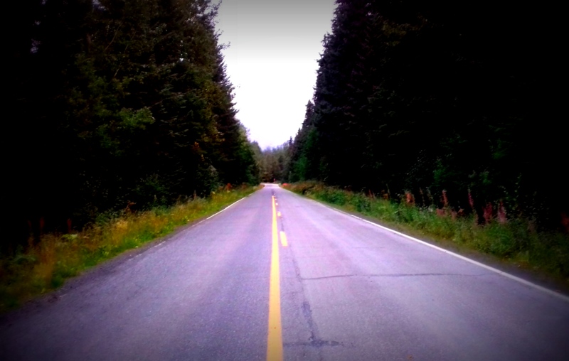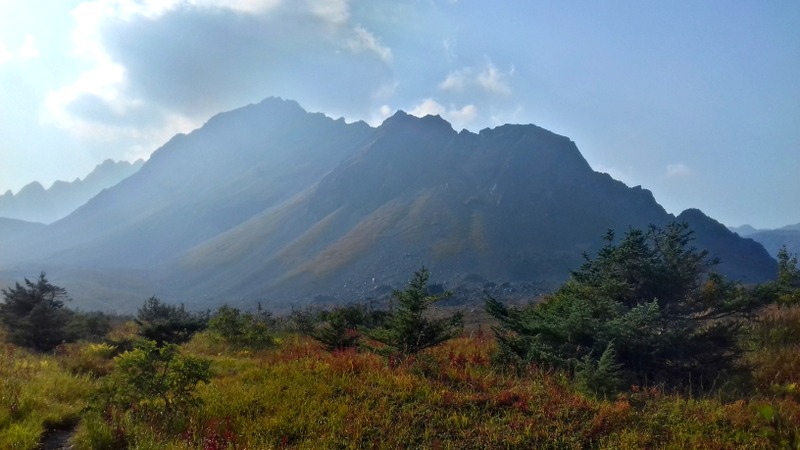 Puis, alors que j’ai rejoint mon covoiturage à la fois en retard et en avance, je m’extraie magnifiquement d’Anchorage. A peine avons-nous dépassé Rabbit Creek Road que les montagnes de Kenai, enroulées plus tard de couleurs chaudes avec le coucher du soleil, émergent gris-bleues de ce matin fumé. Nous longeons la baie, grise elle aussi, sur les rives de laquelle, si la marée n’était pas basse, quelques cachalots nous accompagneraient peut-être ; les monts nous contemplent doucement. Ceux de Chucagh State Park que je délaisse trop tôt, ceux déjà de la Péninsule qui se languissent de mon âme voyageuse.