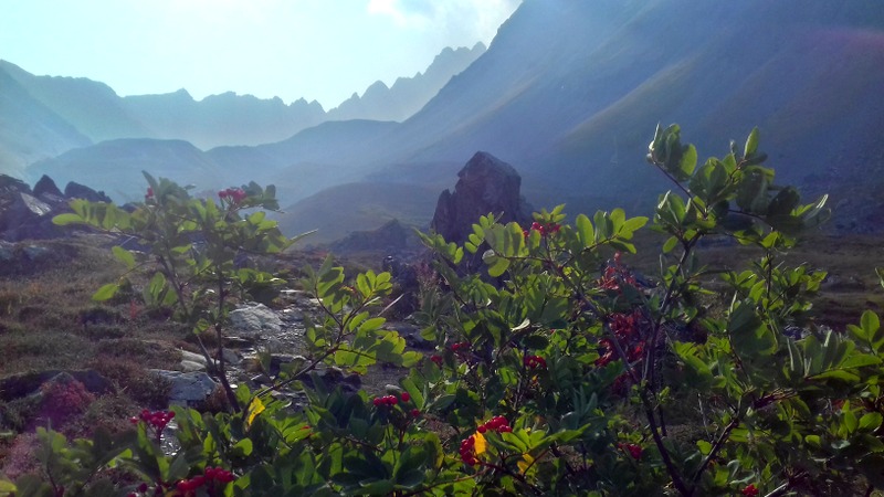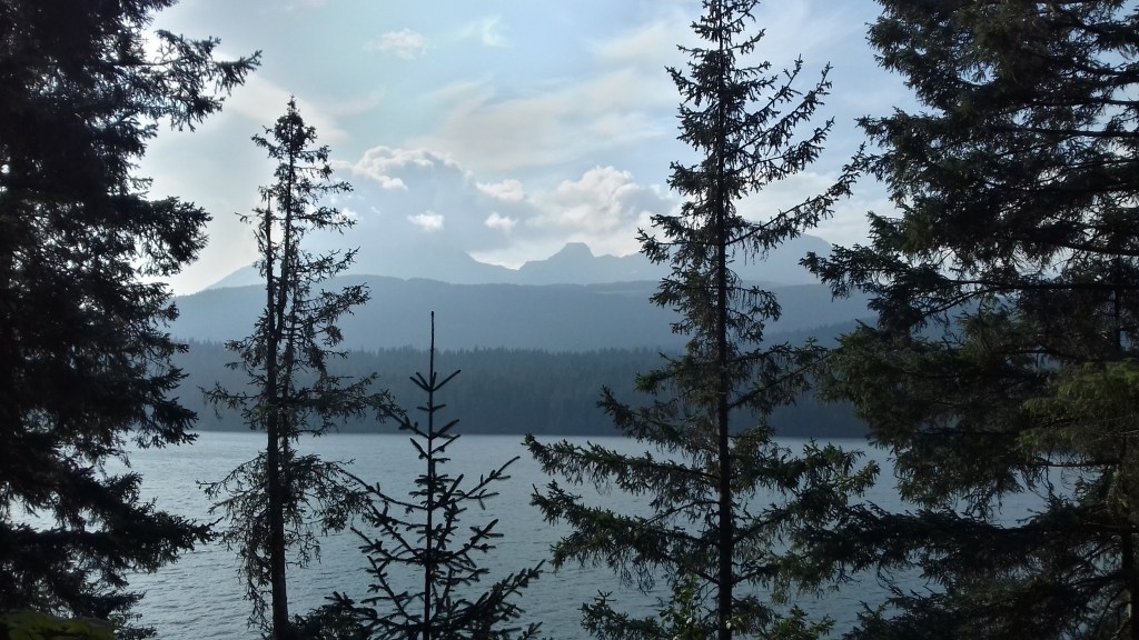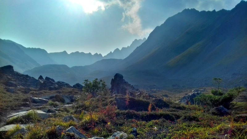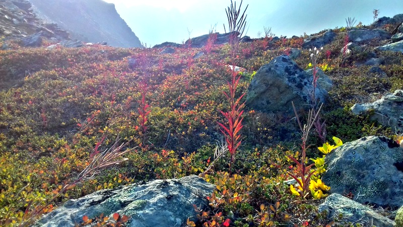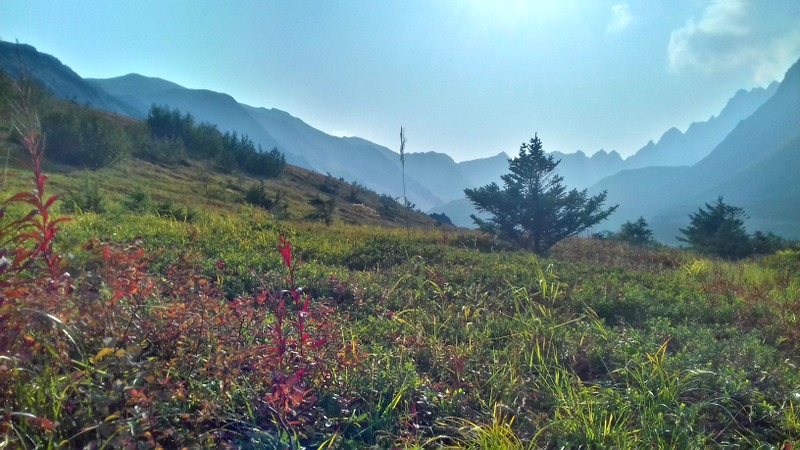 Après un petit morceau de forêt où le chant est le seul repoussoir à ours, la vue se dégage révélant petit à petit les montagnes Des lacs s’offrent timides au loin, gris-bleu au creux des monts. On entend la rivière qui s’élance bien plus bas, invisible, et les épilobes bordent de rose le sentier à myrtilles. Le soleil est là sans vraiment se montrer, fragile derrière son voile argenté. Les conifères s’entremêlent éparses, de plus en plus rares, avec les milles couleurs des plateaux montagneux. Soudain, les éminences vert sapin s’élèvent de tous les côtés et nous mènent doucement au bleu hypnotique du lac perdu. L’eau est si bleue, d’une couleur si pure, arrivée d’une source mystérieuse ; comment mes mots peuvent-ils rendre justice à ce bleu ? Comment aucun artiste paysagiste ou essayiste peut-il rivaliser avec l’oeuvre de la nature ?