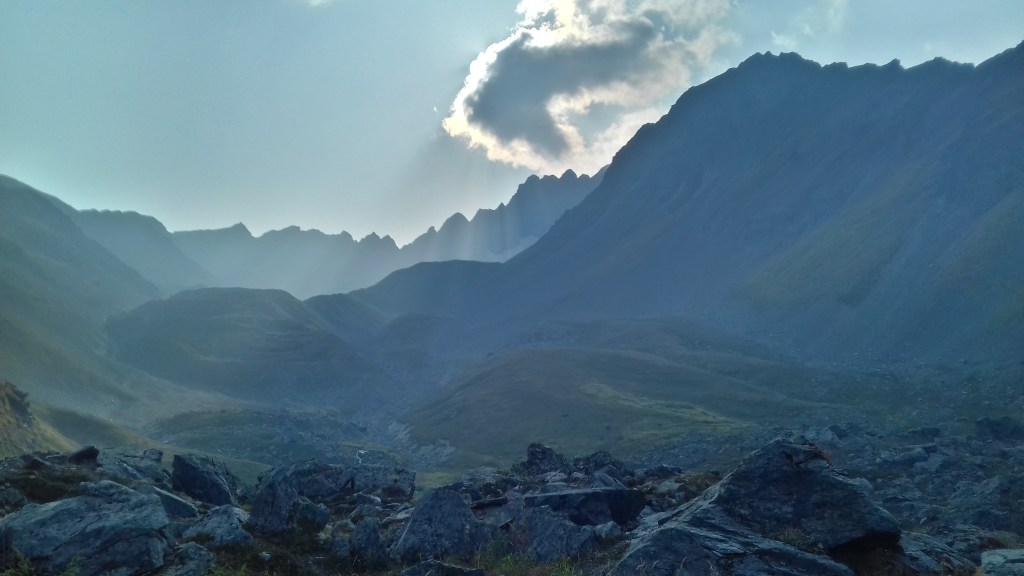 Nous descendons doucement les yeux devant la vallée qui n’a plus le mystère brumeux du matin, le soleil se couvre de gris ou de fumée. Les couleurs changent, c’est le même paysage et pourtant toujours surprenant, pourtant toujours éblouissant. Maman et ses petits sont restés bien cachés. Mon être descendant ressent la satisfaction de l’effort, oubliant les douleurs de la montée, les rouages rouillées de la descente.