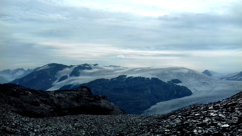 Kenai mélange de plus en plus ses couleurs jusqu’à s’évanouir dans le gris infertile. Cette terre de plus en plus près du ciel se compose et se décompose de mondes que je ne connais pas, elle se dessine et se creuse, souvenirs d’anciens glaciers millénaires aujourd’hui disparus, n’ayant laissé derrière eux que les larmes du sel. Puis de gris anthracite, la montagne devient noire bijou sur le blanc de la neige. On se rapproche des sommets, quelques éternelles demeurent, si timides presque invisibles, malgré l’été si chaud. Nous atteignons le refuge des perdus, inscrits sur tous les aventuriers.