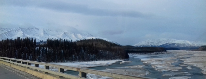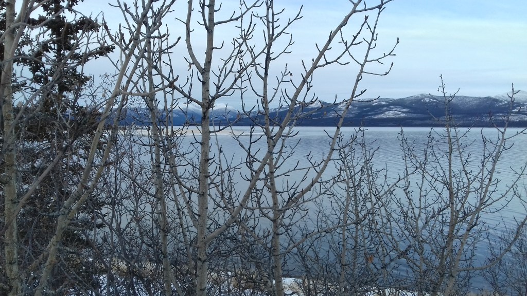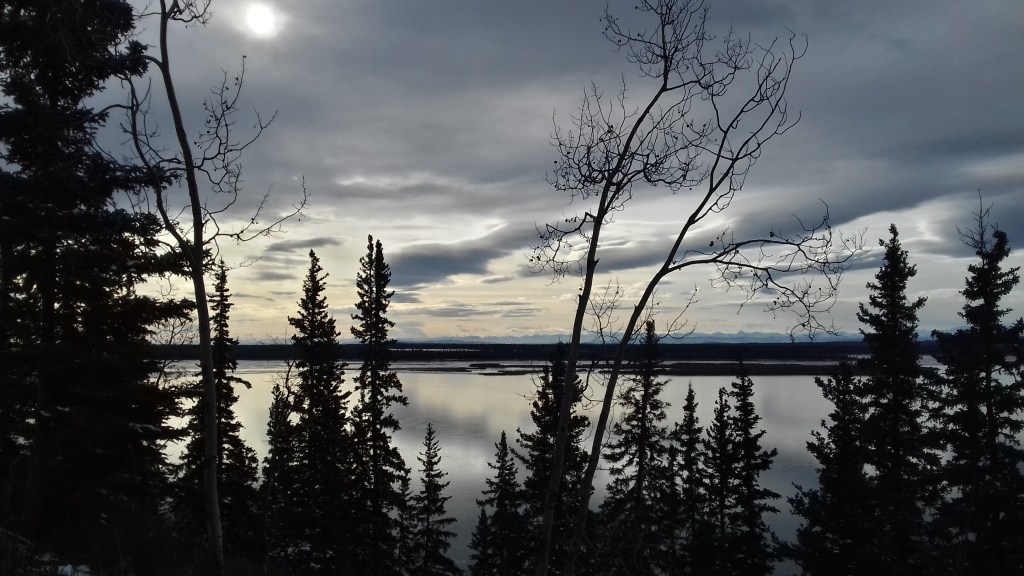 Je me réveille bien trop tôt à Delta, la nuit est encore noire mais le froid engourdit mon sommeil. J’ai survécu à la nuit et à présent, mon anxiété s’apaise un peu. Réécrivant mes dernières aventures avant de reprendre la route, les quelques montagnes alentour, invisibles dans la nuit d’hier soir, s’éclairent à la lueur du matin. C’est alors le signal que je peux continuer mon chemin, je traverse des dizaines de rivières qui ne sont plus que des minces filaments, qui ne sont plus que neige ; flamboyantes dans leur percée laissant soudain place au panorama. Le blanc éclatant des montagnes explose des feux d’artifices dans mes yeux jusqu’à l’arrivée grandiose à Midway Lake et son île glacée de sapins que mon appareil photo ne peut immortaliser car, pour une étrange raison, le réseau autoroutier d’Amérique du Nord s’amuse à placer les arrêts panoramiques dans les endroits les moins panoramiques puisqu’ils sont presque toujours bordés d’arbres à pomme de pin ; mais ma rétine s’en souvient encore. Mon cœur ankylosé prend après le prétexte bienvenu du lac dissimulé pour se dégourdir les jambes et suivre les empreintes des ours. Puis, le paysage fond, c’est à nouveau mort de l’automne sans l’irréalisme de l’hiver, et je pense aux deux uniques arbres dorés de Chena River hier, éblouissants et en retard dans la nature glacée ; ils n’ont pas reçu le mémo que c’était déjà l’heure de la neige, que c’était déjà l’heure de l’hiver.
