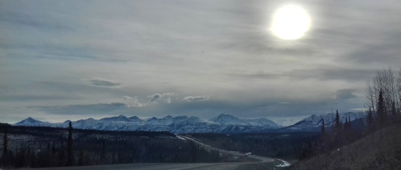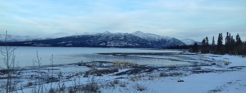 On me laisse néanmoins passer sans ambages, le nœud se défait, la langueur pas tout à fait encore. Canada me voilà ! Je délie l’unique route du Yukon sous mes roues alaskiennes, la même qu’en Alaska si ce n’est que comme entre l’irlande du Nord et le Donegal, on devine que l’on a quitté un pays pour un autre à l’état des routes… L’infinitude des mêmes chaînes montagneuses de l’Alaska continue à s’épanouir au-devant de moi, à travers ce nouveau territoire septentrional, dessinés dans ce même bleu du ciel d’hiver. C’est le bleu brillant d’un ciel d’été et pourtant… On sent presque la glace en le regardant parfois. C’est un bleu qui se sublime souvent d’un nuage de neige, on pourrait le prendre pour un vrai nuage mais il n’a pas la même opacité, il est juste un voile grisé donnant une autre valeur au bleu.