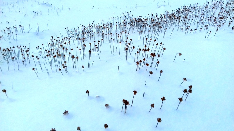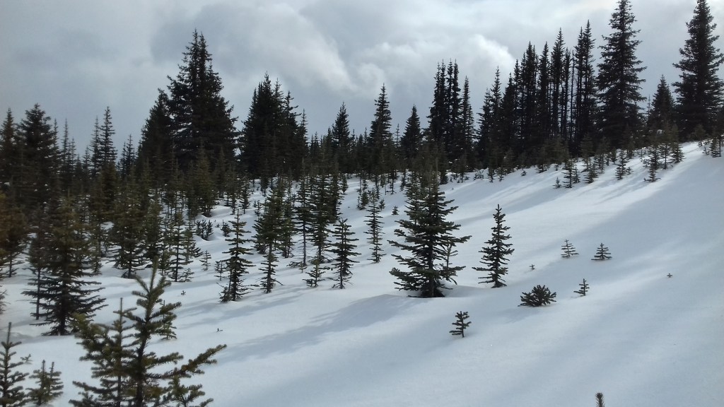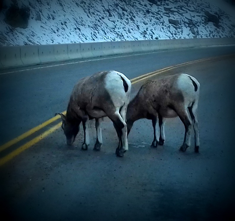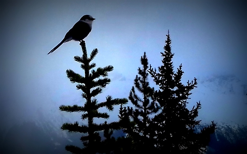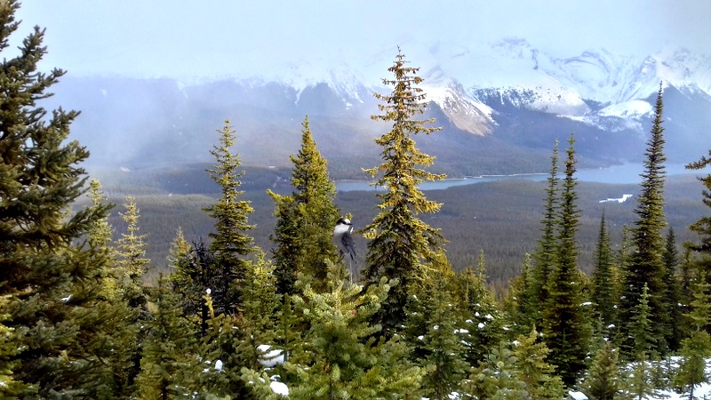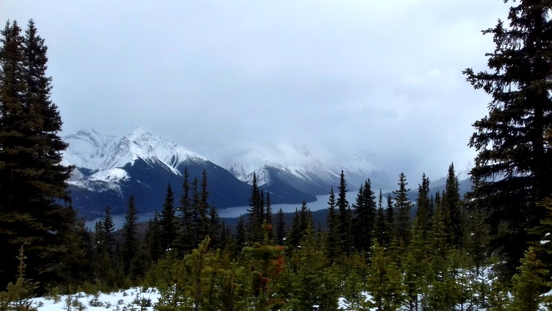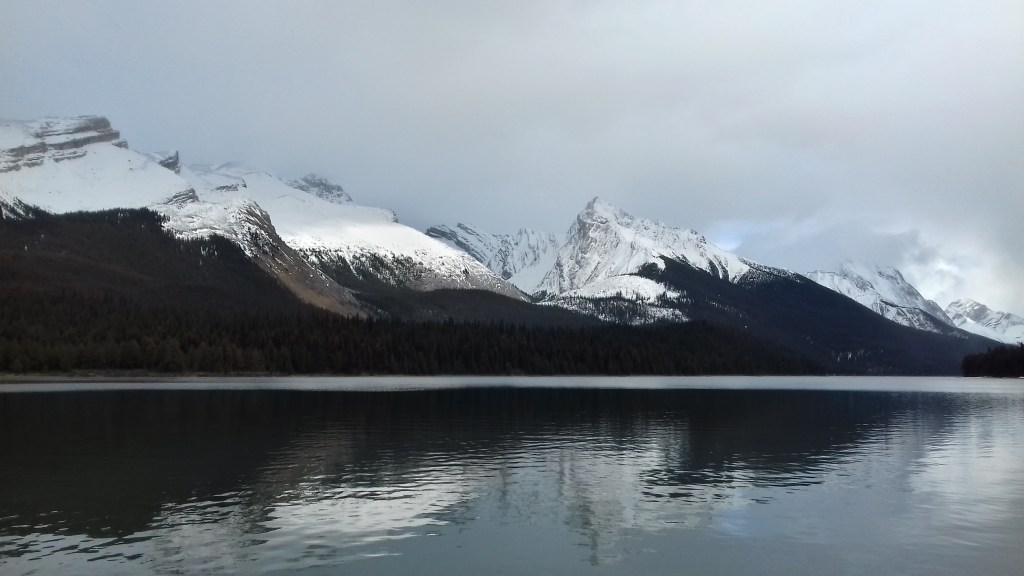 Le matin commence sa journée sur une route parsemée de chèvres des montagnes gourmandes et de cerfs majestueux, direction Jasper où j’envoie mes missives et trouve mon améthyste magique et protectrice. Puis, avec ma nouvelle compagne de voyage rencontrée au Black Cat Guest Ranch, Anja, nous prenons le chemin du Lac Maligne pour mettre nos pas enneigés dans ceux de ma copine Caro qui était ici même il y a un an ! Cela fait du bien de changer de pèlerinage pour une fois… Nous traversons les arbres brûlés d’un autre été, nous arrêtant éblouies par la vison du Lac Medecine presque asséché par la venue de l’hiver, sur fond de montagne par encore tout à fait blanche. Quand nous atteignons le vrai lac de notre point d’arrêt, nous prenons la voie de pompier sous la neige, nos sandwichs de déjeuner enfournées, pour entamer notre randonnée. Mon cœur doute de la vue imprenable au bout du chemin tant le brouillard est épais, mais le soleil triomphe de temps en temps, nous laissant deviner un regard gris enneigé sur le lac au pied des cimes. Nous n’atteignons pas l’ultime tableau cependant, celui du véritable sommet ; le ciel était trop aveugle, la neige trop incertaine. Le peu que nous glanons est déjà magnifiquement offert, timide, à notre randonnée d’automne blanc, mis en chanson par les oiseaux gourmands qui répondent au sifflement enchanté d’Anja.