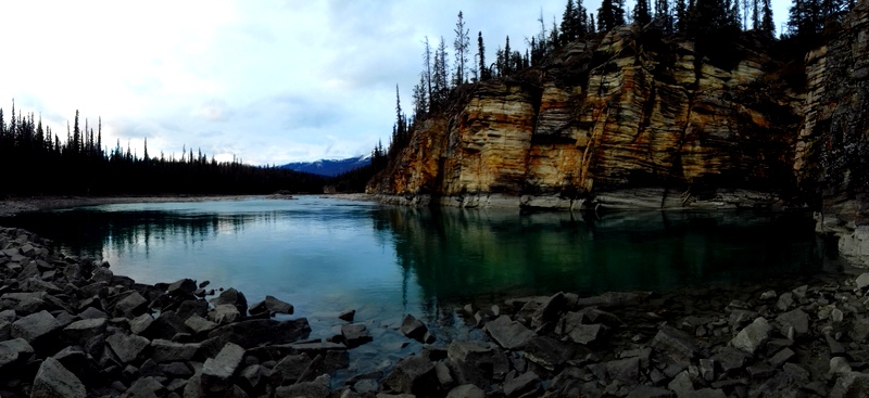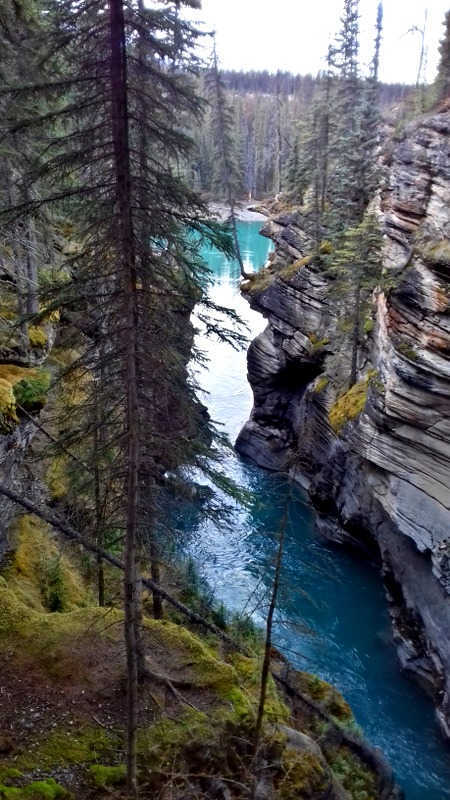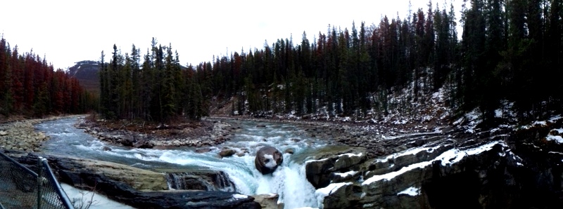 Notre chemin se poursuit dans le jour qui se coucherait déjà presque, afin d’atteindre les deux magnifiques chutes d’eau d’Athabasca et Sunwap, nées du centre de la terre, élevées jusqu’à la cime des montagnes. Hors du commun, presque indescriptibles… Si profondes au creux de la terre, si puissantes au cœur de la pierre. Athabasca m’époustoufle particulièrement lorsqu’elle s’offre sur fond marin de la montagne blanche qui rougeoie du soleil couchant, lorsque je découvre l’eau bleu verte dans laquelle elle se jette. Sunwap m’émeut par ses racines si profondément mises à nues par l’érosion de la terre, par nos pas qui la foulent.