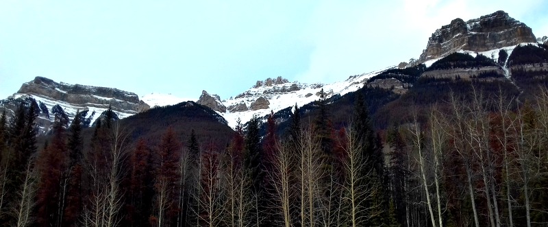 Notre chemin se poursuit afin de rejoindre notre toit pour la nuit. Certains conifères s’ornent de rouge automne trompeurs sur la bas côté, car ils meurent pour de vrai en fait, à cause d’un insecte venu des Etats-Unis. Alors, c’est beau mais c’est triste. Le soir se lève véritablement à présent, au rythme des montagne au formes biscornues qui se déshabillent et se fondent.