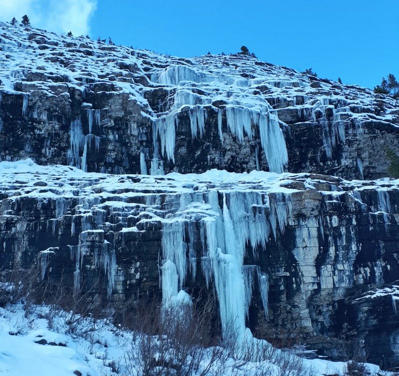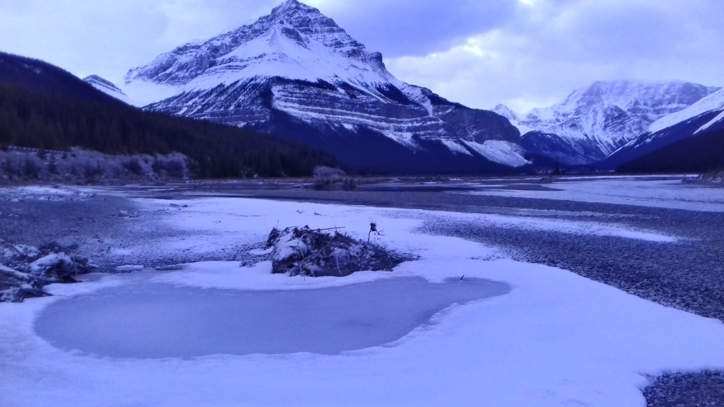 Au petit matin, comme d’habitude par ces nuits de sac de couchage que j’apprends à savourer, je me réveille bien tôt. Sauf que le soleil se lève plus tard que moi et je somnole à nouveau pour quelques tendres minutes avant d’aller découvrir la beauté froide et gelée de Beauty Creek comme premier pas du jour. Le maigre filet d’eau, quand il n’est pas figé ou enneigé par l’hiver, roule doucement vers les glaciers de Columbia au loin et depuis les deux cascades d’hier dans mon dos.