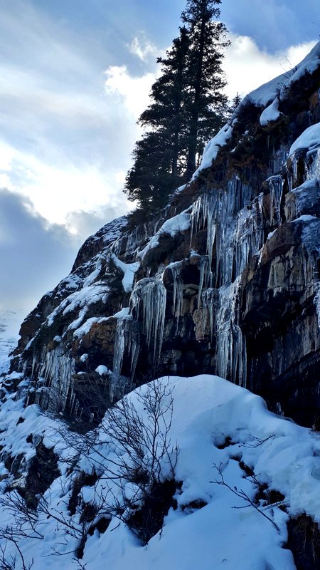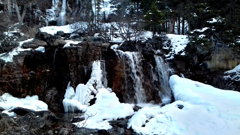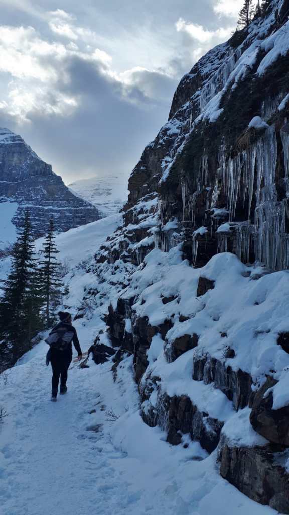 Le ventre à chaud et l’humeur d’Anja souriante à nouveau, nous sommes fin prête à randonner le bleu hypnotique du Lac Louise, le noir de ses rochers alentours, le blanc de ses neiges éphémèrement hivernales, le glacé de ses éternités. C’est une marche de conte de fées alors que nous nous rendons au salon de thé d’Alice au Pays des Merveilles dans le bruit figé en stalactites des minuscules cascades alentours, dans les arbres nus qui laissent transpercer la lumière sur la neige. Nous ne verrons pas le glacier final car je pense déjà au retour à pied dans la neige, car je pense déjà au retour en voiture dans la nuit. Dommage, nous aurions eu le temps mais alors, nous n’aurions pas rencontré le porc-epic en goguette, l’apogée parfaite de cette journée multiple. Le glacier importe peu finalement, la marche fut belle et dépaysante du début jusqu’à la fin, les yeux en pétillent d’étoiles jusqu’à plus d’heure alors que la nuit accompagne notre trajet de retour vers notre grande maison d’autres montagnes.
