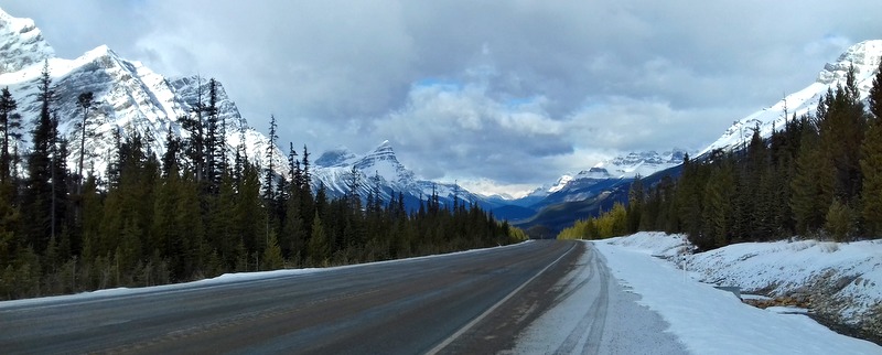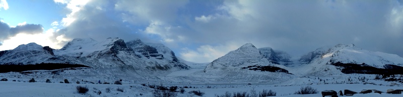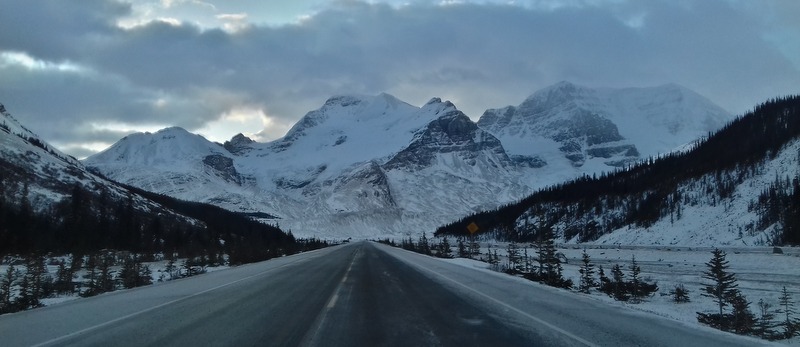 Réchauffées de cette fraîche promenade, la voiture nous ballade à nouveau dans la blancheur du matin pour mieux se jeter dans le gigantesque et irréaliste champ de glace de Columbia. C’est tellement magique de voir tous ces glaciers bleu translucide, bleu immortel qui se confondent à présent avec la poudreuse et viennent trancher mon Exit Glacier vert et toujours en été de l’Alaska. Il a tellement neigé sur la route alors, nous ne pouvons regarder les glaciers de plus près. A la place, nous contemplons depuis quelques cimes, la magnifique descente de soleil vers Saskatchewan River dans laquelle nous tourbillonnons à couper le souffle.