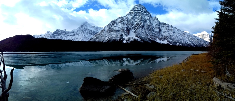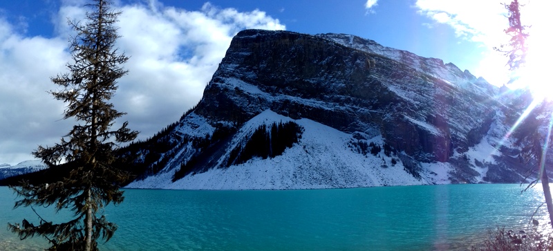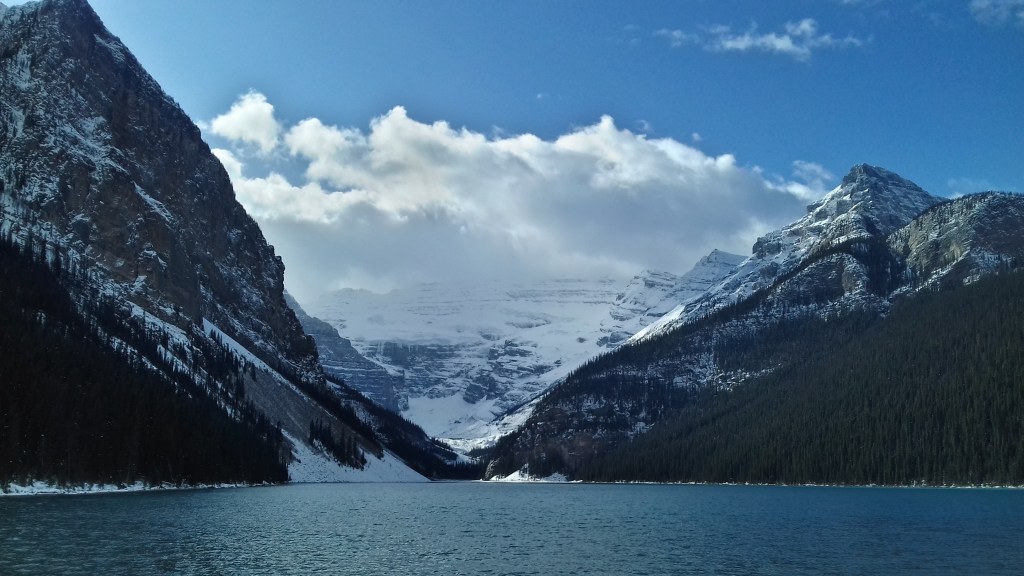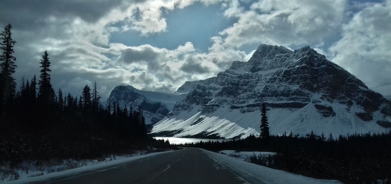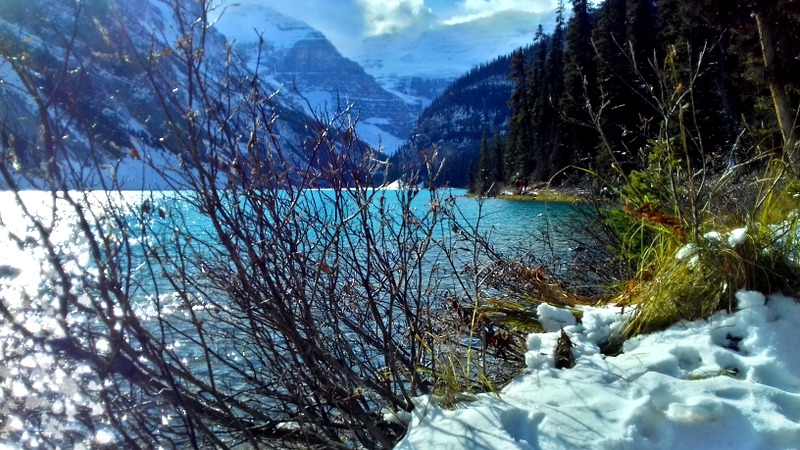 Nous nous arrêtons toujours frileusement à Mistaya Canyon. C’est encore une fois l’incroyable épopée de l’eau qui a creusé la roche, de sa lente érosion, de son furieux courant. C’est encore une fois une aventure millénaire qui m’émeut indiciblement. Le matin se lève alors véritablement, plus brillant, nous gardant affamées vers le lac Louise. Tout ce qui aurait pu nous réchauffer l’estomac a fermé avec la saison, nous devrions courir d’une traite à la prochaine ville. Pourtant, chaque cascade gelée m’appelle, chaque lac luminescent m’attire, et me laisse pour toute compagnie une amie de plus en plus mal embouchée. On finit par arrêter de s’arrêter néanmoins et rejoignons notre cantine négligée.