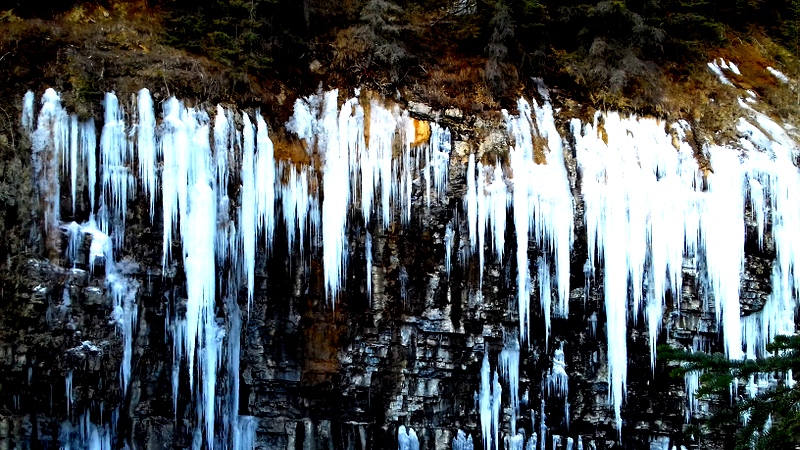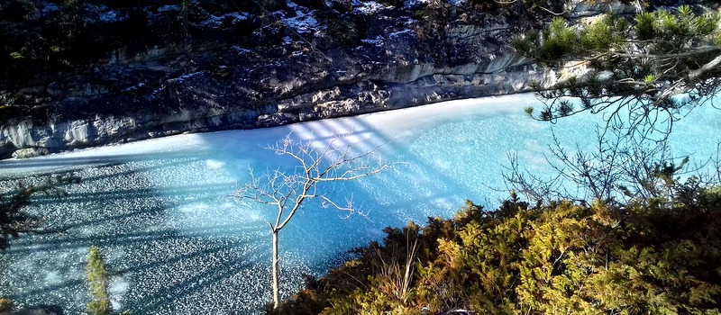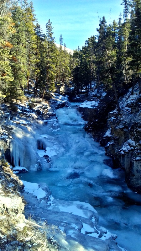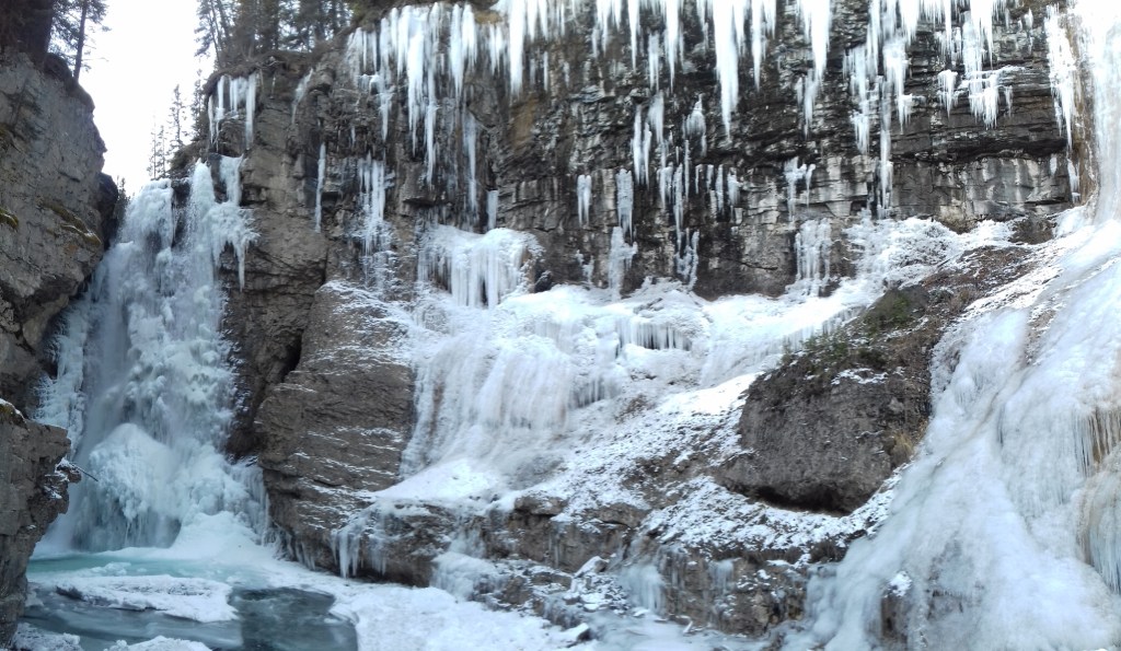 Un sandwich au thon glacé en bouche, je prends à l’envers la route que j’aurais du prendre à l’aller pour pleinement profiter du panorama. Je fais une dernière halte à Banff pour quelques emplettes et avoir l’impression de vraiment être passée par là. Puis, longeant la route vermilion du lac glacé sur lequel des gens patinent déjà même quand le gel n’a pas encore pris à quelques centaines mètres, j’enfourche la promenade de la vallée Bow afin de rejoindre Johnson Canyon où m’attend une magie similaire aux multiples chutes d’eau de Beauty Creek, tant le courant se glace magnifiquement. Le sentier qui ressemble plus à une autoroute, manque néanmoins de l’authenticité de la veille et du matin.