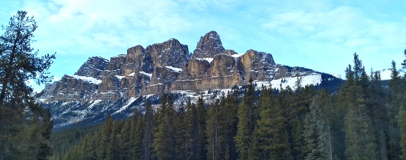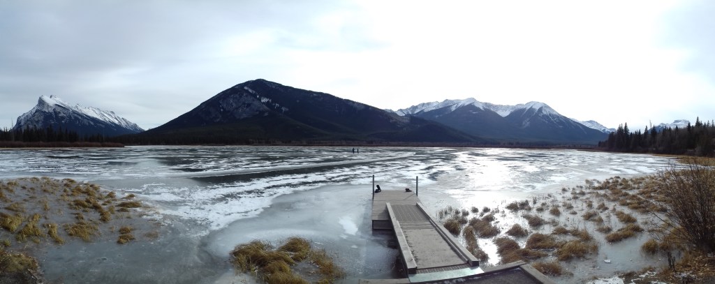 Après cet instant de merveilles magnifiques, je finis mon chemin du jour sans presque aucun arrêt. Juste le temps de constater qu’une cascade a été totalement vaincue par le gel quand elle se luminait de ses stalactites la semaine dernière. Juste le temps d’être subjuguée par le lac vert totalement gelé aujourd’hui. Puis, après un trajet qui se fatigue, j’arrive à Banff dont les montagnes neigeuses rosissent dans le soleil couchant.