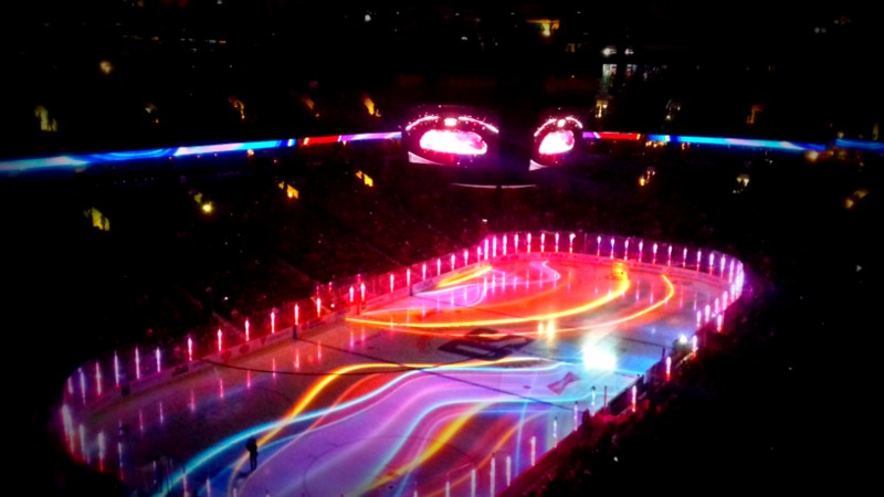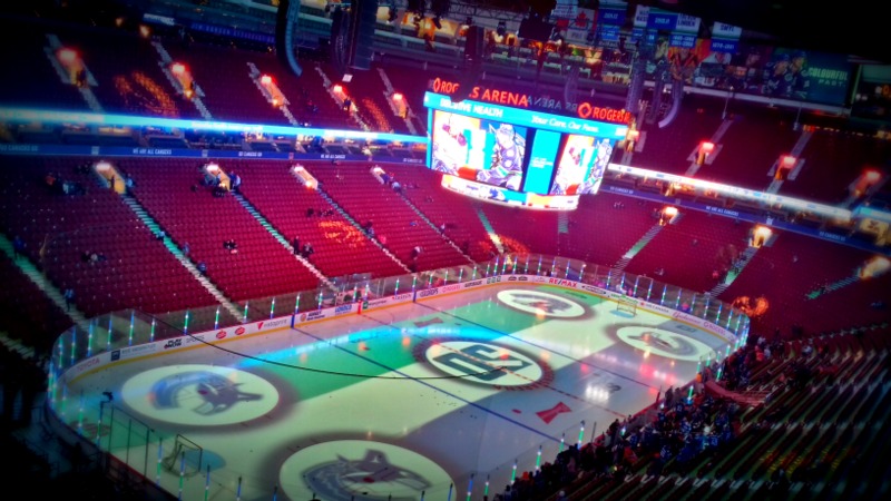 Comme toujours, il fait nuit très vite mais la journée est loin d’être terminée. Les jours métropolitains sont si longs, je ne suis plus arrêtée par le ciel noir car il brille des lumières de la ville. Car il se magnifie. Vancouver accueille un match de hockey ce soir et je n’arrive pas à me décider. Je voudrais tenter le bar mais j’ai le cœur gourmand… Ruiné mais gourmand ! Alors j’achète le ticket à la sauvette, je me jette dans la gueule des Canucks au son ému de l’hymne canadien, drapeau d’érable au vent immobile, la main sur le cœur du Canada ! Quelle expérience ! Quelle virtuosité ! Les actions sont d’une telle rapidité, d’une telle agilité. Je m’attendais néanmoins à plus de bagarres et suis un peu déçue de ce côté-là. Il paraît que le sport s’est bien lissé depuis quelques années.