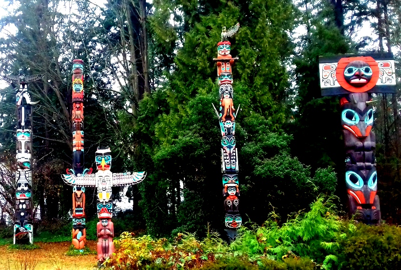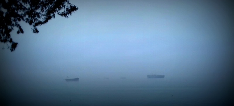 Puis, coursée par la montre pour que la voiture ne me soit pas enlevée, je me dirige vers Stanley Park que je ne peux (et ne veux) pas faire à pied. Un autre jour peut-être. Quand Dieu aura arrêté de pleurer et que je pourrais voir les montagnes derrière la baie. Le panorama aux arbres gigantesques n’en est pas moins ressourçant… Si verts à deux pas, derniers vestiges des anciennes forêts des pluies. Oh, et ce bateau dans la brume qui ressemble exactement à mon soleil de nuée irlandais*. Et le lac Lagon émanant encore ses chaleurs d’été entre quelques arbres d’automne larmoyant. Je cours encore, ruée vers le musée d’art avant la fermeture. Déçue. Un peu. Encore une fois. Si ce n’est l’exposition autochtone du dernier étage.
