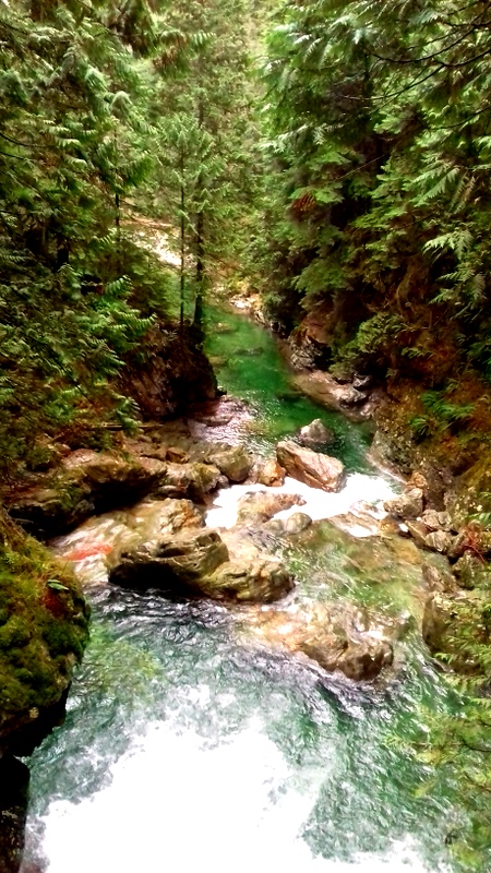 Je pars dans le matin encore sec, oscillant encore un peu dans la ville majestueuse, prenant le chemin de North Vancouver pour dire au-revoir comme il se doit. Je traverse le Lions Gate Bridge photographié hier, hasardeuse dans mes destinations choisies. Le Capilano Canyon, plus attraction qu’aventure, n’est pas encore ouvert à mon passage ; le barrage de Cleveland est brumeux et rapide ; la montagne de Grouse est invisible et trop difficile, même si elle m’entraperçoit Vancouver au loin. Je m’en retourne donc à ma première envie : Lynn Canyon dont les arbres moussus sont une fois encore d’un vert irréel, d’une consistance improbable. Le pont suspendu m’est cependant inaccessible et le canyon vertigineux presque invisible aussi. Il ne m’en est pas moins si agréable de vagabonder entre les cèdres aux troncs rouges et aux branchages verts.