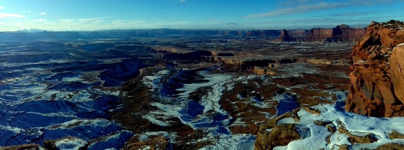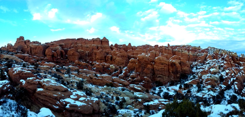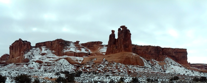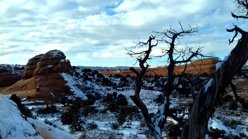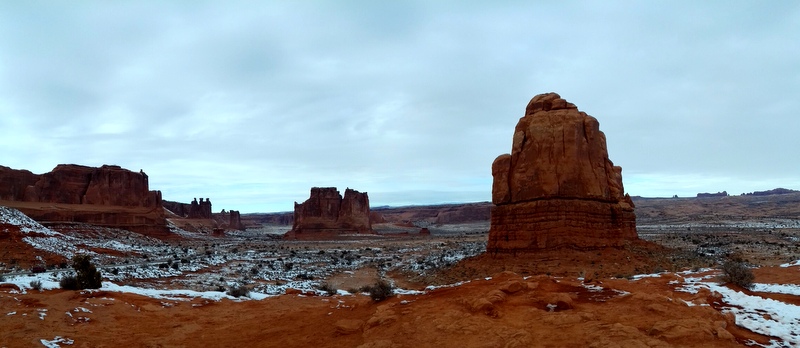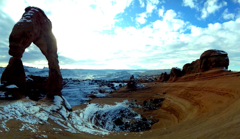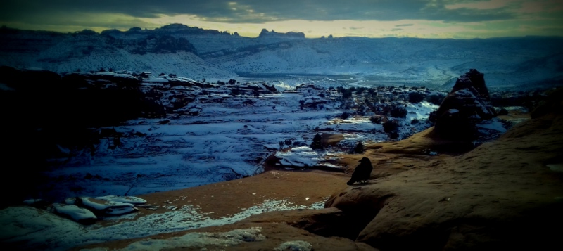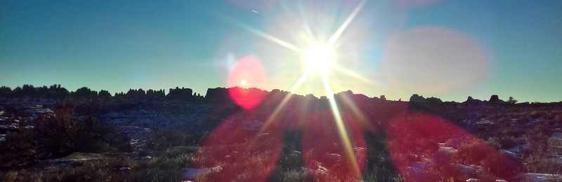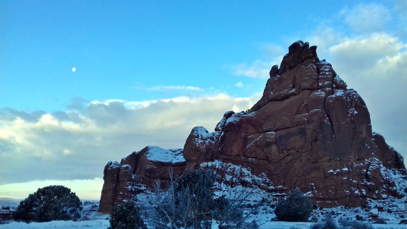 Je pars dans un matin incertain, tirant vers le soleil d’un côté et vers la neige de l’autre. Je longe Utah Lake, certainement vu du ciel lui aussi. Mais bordé de plus loin, je ne peux que deviner ses couleurs bleutées entre les sommets enneigés qu’il sale peut-être parfois. Puis je quitte l’Interstate 15 pour prendre à l’Est et le paysage se métamorphose à la fois doucement et drastiquement alors que je traverse des montagnes dont je ne connais pas le nom. Je rencontre la nouvelle facette de l’Utah ; de ses tons pastel, le panorama révèle la flamboyance de son rouge ardent sous la neige. Je découvre l’autre facette de l’Utah, celle qui rougit dans le soleil immortel de l’hiver, celle qui se découpe bientôt en arches irréelles et rigole en gorges immenses.