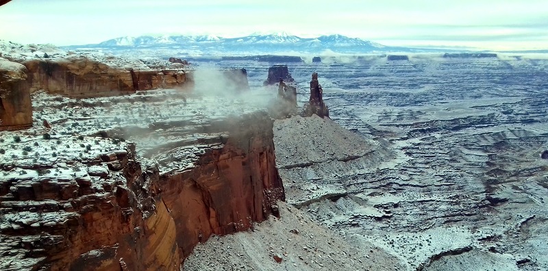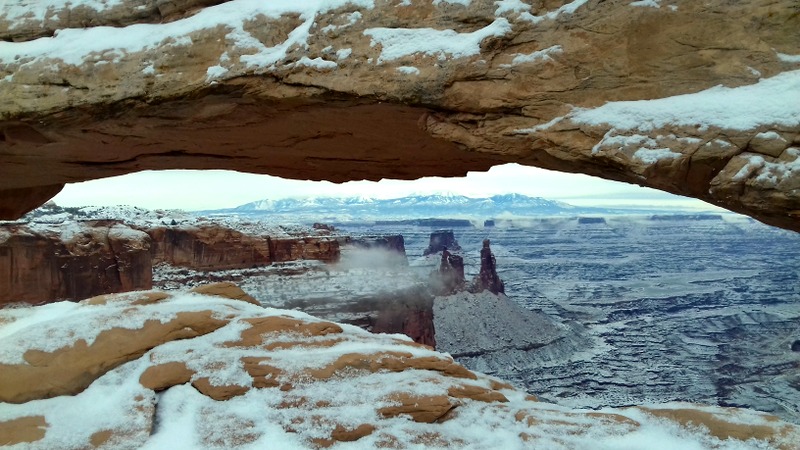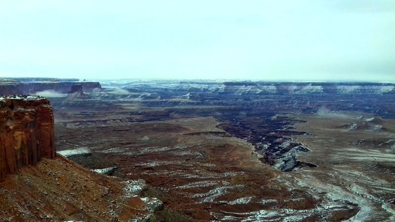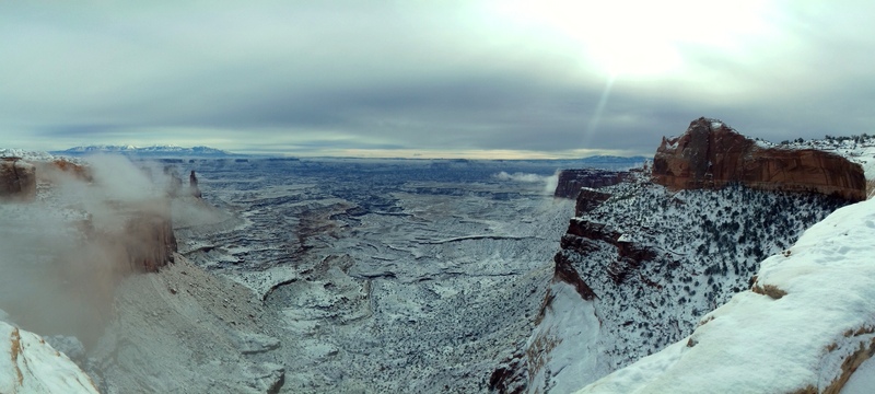 Je fais un premier arrêt à l’Arche Mesa, moins impressionnante, moins délicate que celles que j’ai observées au parc voisin. Mais l’arche ne compte pas véritablement, c’est la fenêtre qu’elle ouvre sur le vide, c’est la fenêtre qu’elle ouvre sur le vertige immense qui me transporte. C’est un creux gigantesque rouge et blanchi dans lequel on ne sait plus véritablement définir les reliefs, si ce n’est les colonnes en fond d’image. Le paysage est presque immobile, figé ici et maintenant pour l’éternité. Même le brouillard semble arrêté et pourtant il nous pénètre et nous rend aveugle en une minute.