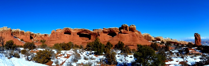 Le froid recommence à perturber mon sommeil, rendant mon départ facile aux premières heures de jour, même si le soleil n’est pas encore de sortie. Je prends mon cours de rattrapage entre les arches. Les paysages se teintent de grand soleil, passant du Nord vers le Sud, d’une fenêtre de roche à l’autre. Fenêtres qui ressemblent en fait plus à des portes sur l’autre monde tant elles sont immenses. Et soudain toutes les arches dépareillent sur fond bleu éclatant.