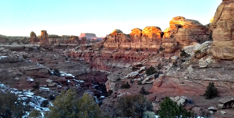 Je me dis que je connais, que j’ai déjà vu le paysage rouge et les crevasses, je suis donc moins préparée à mon émerveillement finalement. C’est toujours Canyonland mais c’est encore autre chose, c’est encore différent. Parce que cette fois-ci, je ne regarde pas d’en haut, je regarde d’en bas. Je ne suis pas au plus profond du canyon ; je serpente entre les plateaux solitaires qui ont la même forme qu’hier, plats au sommet, rectangulaires sur toute la partie haute et soudain une dégringolade de pierres. Et tout cela rouge, si rouge. Le blanc ne s’est pas invité. Je suis subjuguée alors que je ne suis même pas arrivée au point final de ma destination. Ce n’est qu’un avant-gout, une gentille introduction parce qu’après, ça se met à danser sur les plateaux. Ça se dessine en longues tiges longilignes à contre-jour !