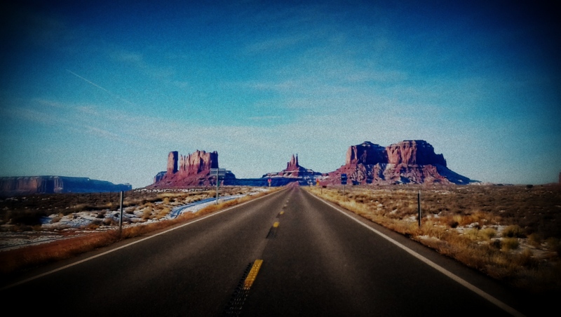 Le matin de Monticello (UT) dessine une maigre couche orangée en haut de l’horizon et à travers ma fenêtre aussi givrée que mon sommeil. Je m’échappe du vent du désert suivant la course du soleil et de la lune, découvrant bientôt la Mesa que l’on appelle blanche car elle paraît si claire après tant d’écarlates, découvrant bientôt de nouveaux reliefs pourpres. Arrondis et charnus comme une brioche, totalement rouges, sans trace aucune de neige, rebondis de buissons vert foncés. Je traverse la rivière San Juan qui, telle toutes les eaux de la région, a tracé son propre canyon. Puis, je finis par apercevoir au loin la fameuse et majestueuse Monument Valley. Elle ressemble presque aux sculptures de Canyonland vue d’ici.