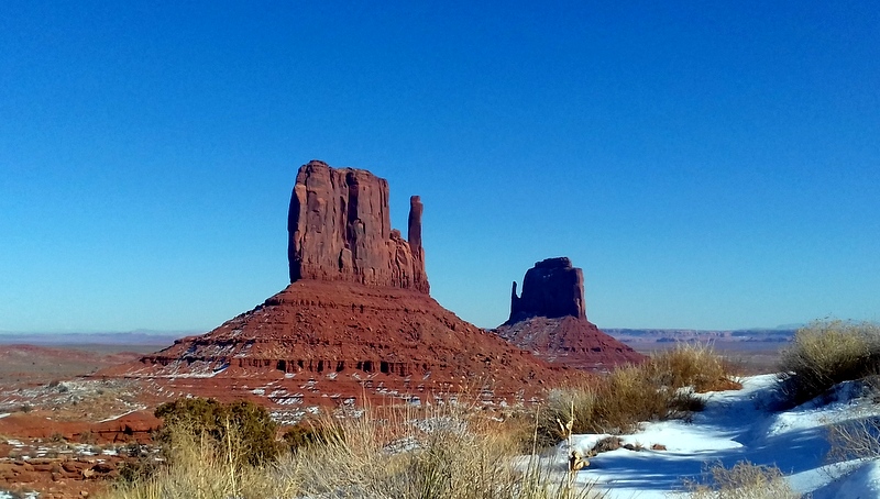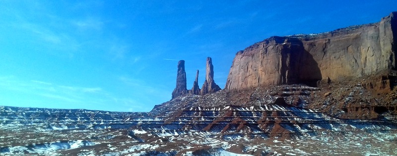 Je tressaute joyeuse sur la route à nouveau goudronnée, en route vers l’Ouest et vers le Sud. J’admire d’autres monuments rouges défiler. Puis la montagne Navajo au bord de la falaise. Mais alors, je commence à me contrarier ; le chauffage se met en grève et j’anticipe ma nuit impossible à venir. Si je ne peux réchauffer l’habitacle avant de m’arrêter, je ne pourrai survivre à la nuit glaciale.