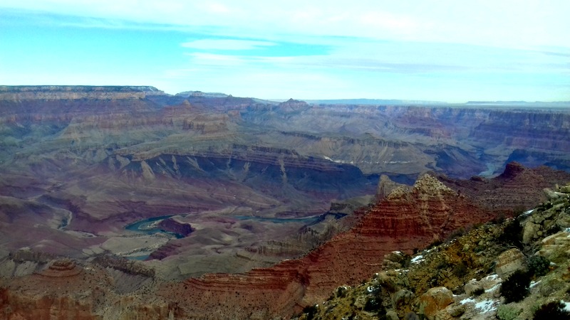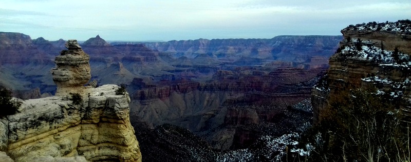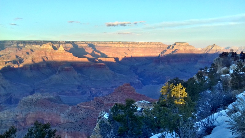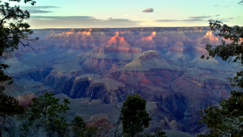 Je fais une pause ventée et ensoleillée à la bibliothèque du village du Grand Canyon, surprise de constater que des gens qui ne sont pas des touristes vivent ici. Ma journée s’achève tout de même sur la falaise et dans le froid alors que le canyon se colore du coucher du soleil. Protégée de ma chapka qui fait désordre, le vent glacé me rougit les joues et le cœur. Je sens pleinement là, je contemple médusée cette immensité de la nature. Cette énigme. Car, si j’entends comment la roche s’est creusé en profondeur – parfois même jusqu’au cul de la bouteille, jusqu’aux entrailles du sol -, je ne comprends pas forcément les reliefs qui nous y mènent. Heureusement, Monsieur le musée de la géologie m’explique : c’est parce que la pluie a fini le travail de la rivière, elle a affiné l’esquisse du Colorado.