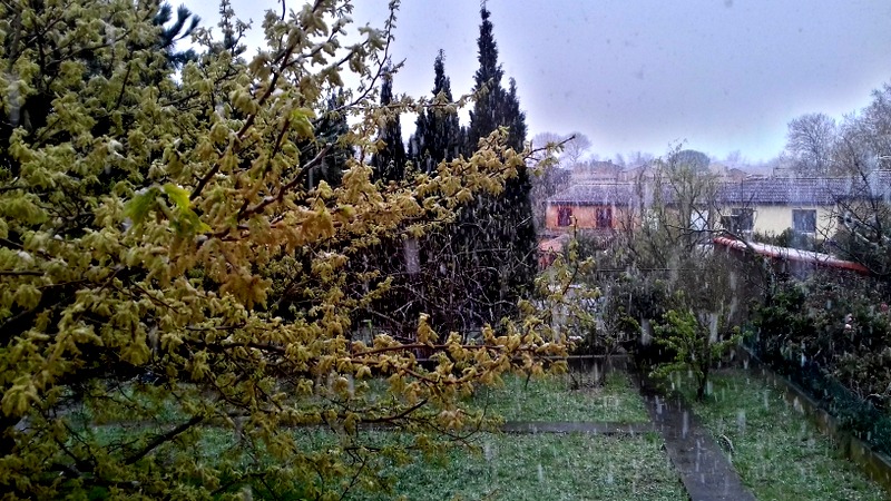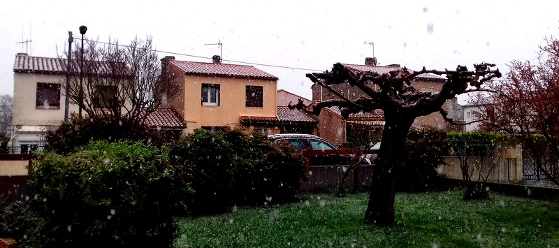 Ce matin, mon réveil neige à gros flocons. Absolument inattendu après le grand soleil d’hier. La France n’a pas eu d’hiver mais elle se met à la neige au milieu du printemps ! Le monde va mal…