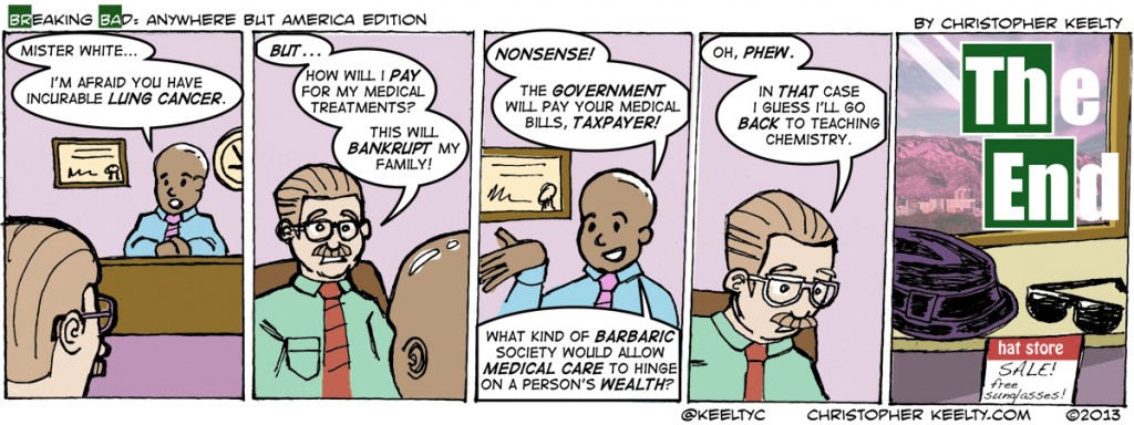 Traduction : Monsieur White, je crains que vous n’ayez un cancer du poumon absolument incurable. – Mais, comment je vais payer mon traitement, ça va mettre ma famille sur le paille! – Mais qu’est-ce que vous racontez ! Le gouvernement va payer votre traitement puisque vous avez cotisé toute votre vie. Quel genre de société barbare ne permettrait qu’aux personnes riches de se soigner ? – Ouf, dans ce cas, je vais retourner enseigner la chimie. FIN