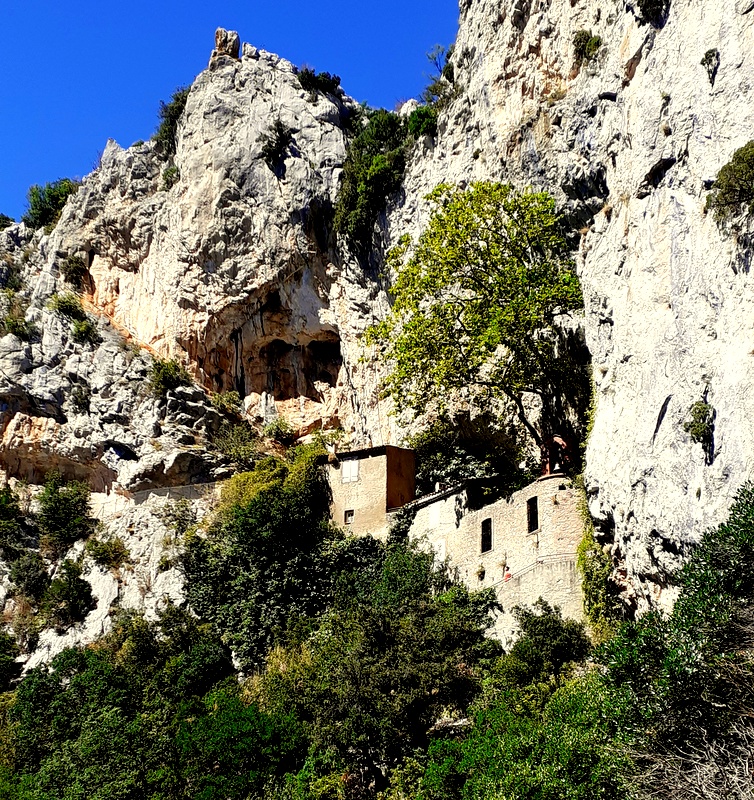 * Pour les moins hardis (comme moi cette fois-ci), il y a la courte ballade de l’Ermitage (45 mins) qui, comme son nom l’indique, permet de découvrir l’ermitage et de capturer quelques visions de beauté plus rapprochées du vertige rocheux que l’on surplombe. Je conseille de prendre le départ au Parking n°3 de l’Ermitage si le stationnement le permet, mais il est aussi possible de prendre la ballade à rebours depuis le Parking n°2 du Belvédère. Cette portion du petit chemin pierreux (entre le Belvédère et l’Ermitage) fut longtemps le seul moyen d’accès au renfoncement de retraite.