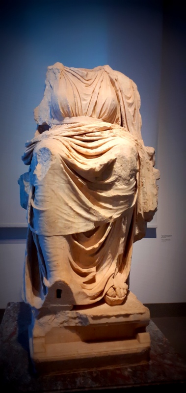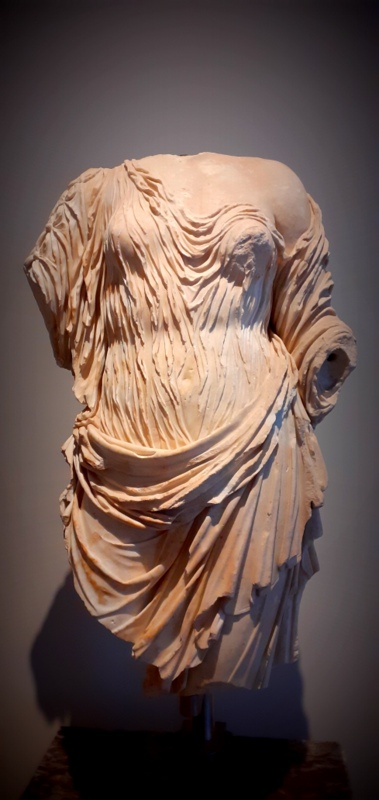 Le drapé commence à se mouvoir, j’oublie la chaleur, j’oublie la sueur et la soif. Le drapé commence à se mouvoir et la chair de marbre à travers lui. Je devine la démarche princière du pas délicat des Vestales. Car les statues en marbre ont toujours le pied délicat, vous l’aurez remarqué. Et des proportions parfaites bien évidemment. Mais leurs rondeurs sont plus ou moins généreuses selon l’époque, je pourrais presque reconnaître mon corps sous l’habit de l’une d’elles. Une seule. Car les autres s’éfillent telles des branches d’olivier, telles des fleurs d’oranger. Mais qu’importe, le marbre me raconte une histoire, il me transporte quelque soit le tour de taille de ces statues défigurées.