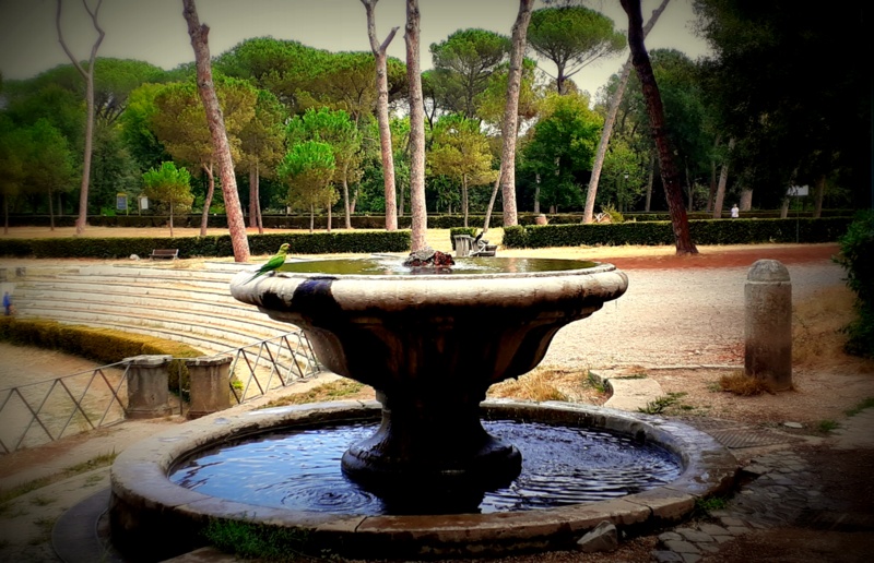 J’ai contemplé « toutes » les fontaines d’albâtre de Rome, préparée aux grands bouleversements qu’elles provoqueraient en moi à grand force de tritons, de muscles saillants, de mythologies latentes. Et c’est pourtant moi qu’elles ont presque laissée de marbre justement… Et ce fut les plus surprenantes et inattendues d’entre elles qui m’ont touchée. Point de marbre blanc ni de statues dont jaillissent des eaux turquoises. Simplement la poésie de la vie ordinaire glissée entre deux fontaines par l’envol libre d’un perroquet vert au bec orangé.