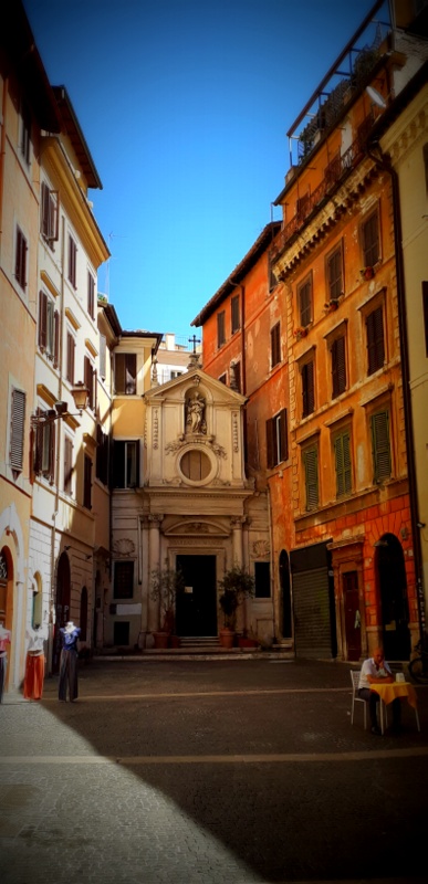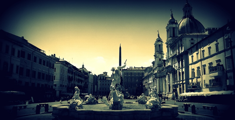 Et je poursuis les labyrinthiques ruelles entrelacées qui me déversent finalement et aveuglément sur des piazze gigantesques à obélisque ou fontaine ou les deux. De l’infiniment petit à l’infiniment grand, c’est soudain le marbre éclatant qui rayonne en plein soleil, ce sont soudain des bâtisses imposantes qui offrent leurs façades austères ou luxuriantes ; et l’on se sent aussi minuscule que l’on se sentait immense. Et l’on se sent aussi bouleversé que l’on se sentait rocambolesque.