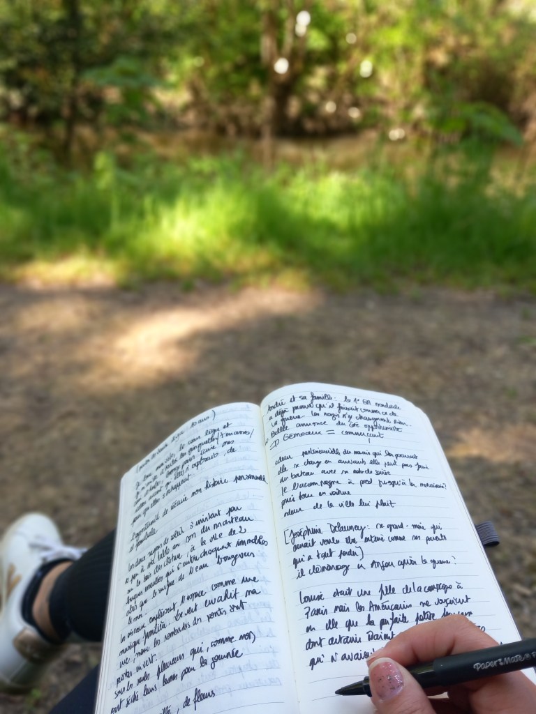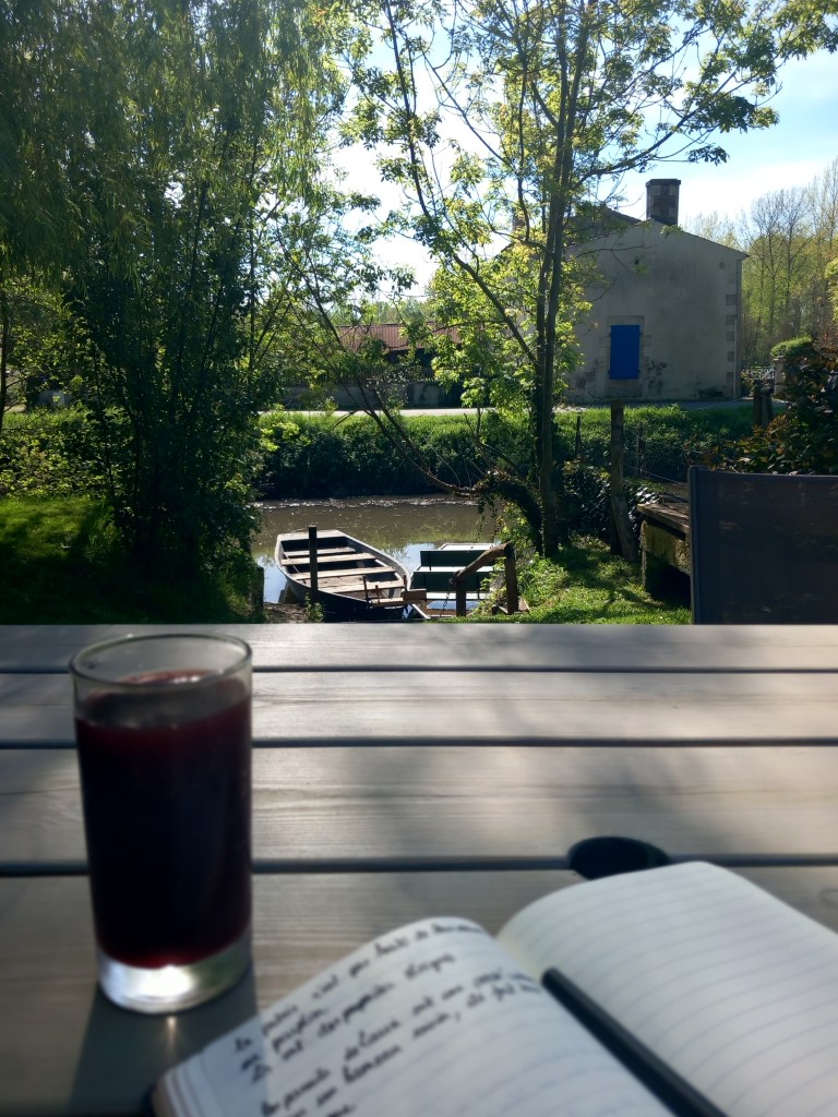 Et de Coulon à Arçais, en passant par Le Mazeau, en bifurquant par Le Vanneau-Irleau, en détournant par La Garette, je m’arrête à toutes les guinguettes / terrasses improvisées / coins d’herbe fraîche / berges dépareillées, pour écrire mes idées romancières avant qu’elles n’explosent. De peur qu’elles ne s’échappent. A l’abri des saules pleureurs qui, comme moi, ont séché leurs larmes pour la journée, l’imagination me turlupine… Elle improvise des chapitres entiers pour faire la nique à mon ancienne page blanche. Elle invente de nouveaux articles de voyage pour venger mon immobilisme récent.