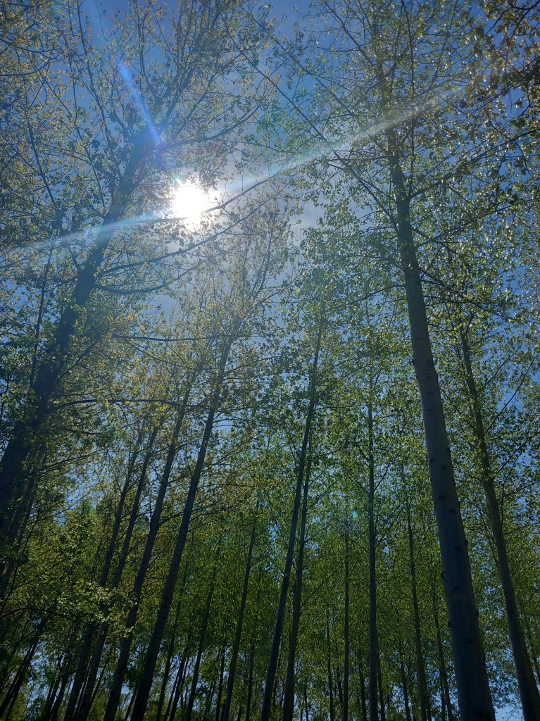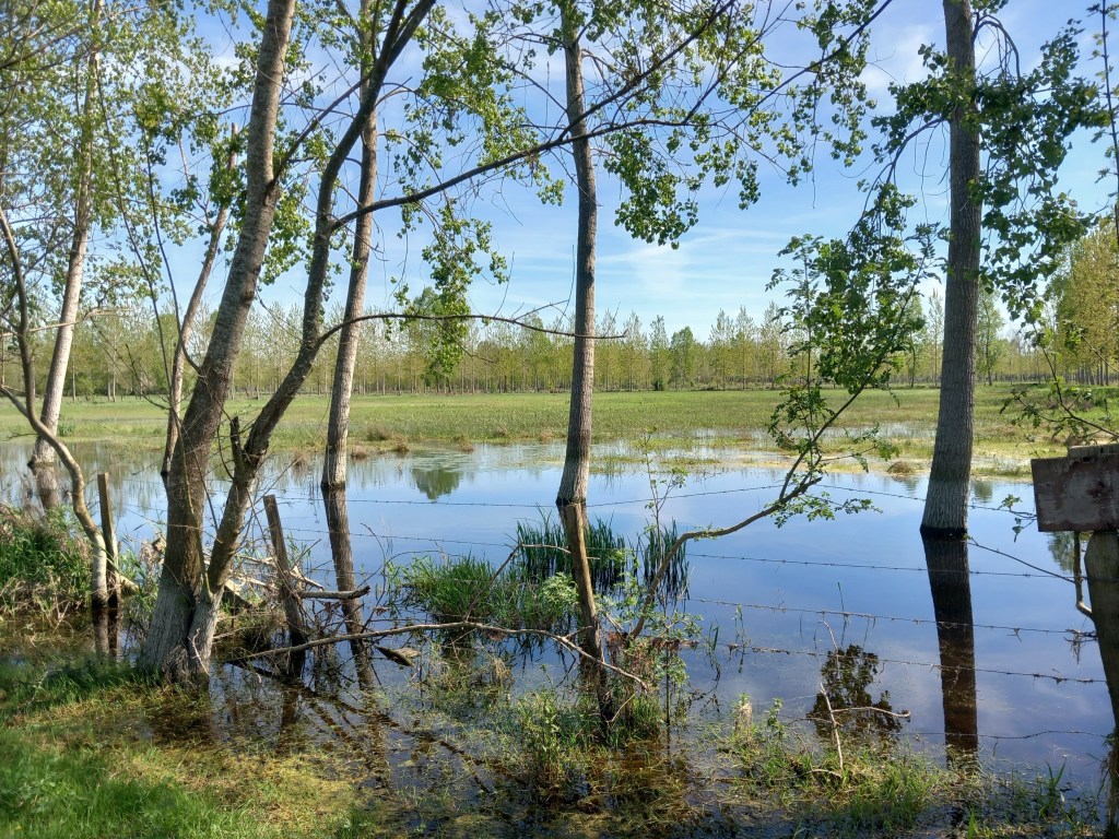 Je longe, sur les chemins plus ou moins blancs, les champs immergés bordés ça et là d’allées de peupliers entrecroisés de frênes. J’observe d’un œil documentaire chaque recoin de chaque paysage pour en faire un périple réaliste, pour en faire un roman de voyage. Au sens propre comme au sens figuré. Je me laisse arrêter par chaque tableau vivant. Un troupeau de hérons garde-bœuf qui surveille les troncs d’arbre faute de bétail. Je me laisse émouvoir par chaque œuvre de la nature. Une allée de statues en frêne, étêtées et manchotes, comme les statues de marbre du Colisée à Rome, mais écorchées à coup d’écorces celles-ci. Je me laisse bercer par chaque surprise du vent ensoleillé. Des forêts de peupliers qui murmurent entre eux à l’orée de la canopée.