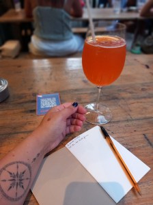 Contemplative au bord d’un Spritz et de la Garonne (d’accord, j’avais parlé de bière mais, ce soir, je suis plus d’humeur Apérol que houblon), je m’attable à mon mini carnet de sac à main, celui qui tient dans la paume de ma main. C’est un peu la version « baise-en-ville » du carnet… Vous savez, le baise-en-ville, cela peut être cette petite trousse de « secours » qui contient, au hasard et selon la taille du sac à main, déodorant, brosse à dent, culotte, tampons, pastilles à la menthe, et capotes pour les plus joueuses, petite trousse un peu fourre-tout que l’on glisse dans ledit sac à main au cas où. Donc là, c’est le mini carnet qui rentre dans mon sac à main quand je n’ai pas prévu de laisser mes errances se poser sur le papier et que j’appellerais pour les besoins de cette prose un « écrit-en-ville ».