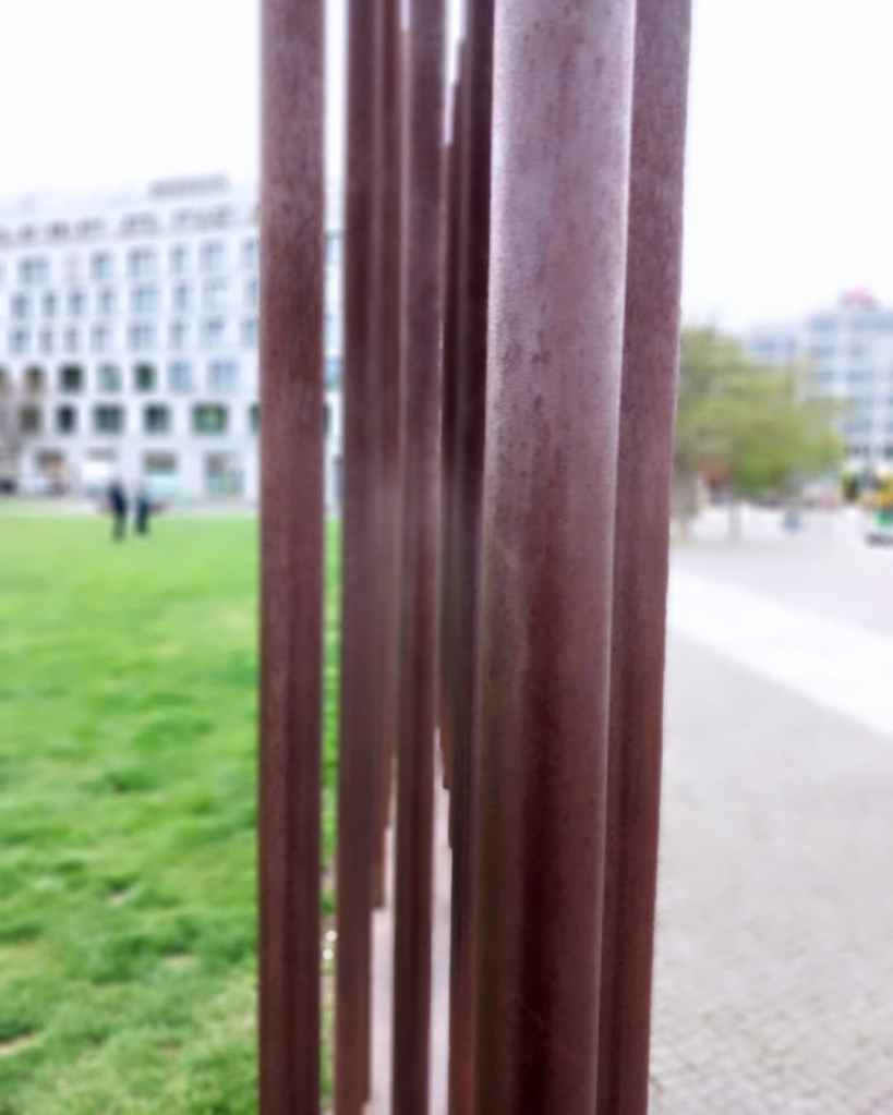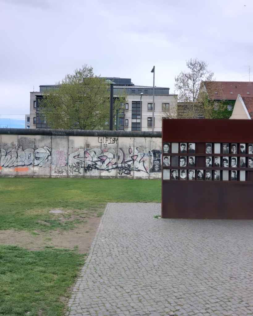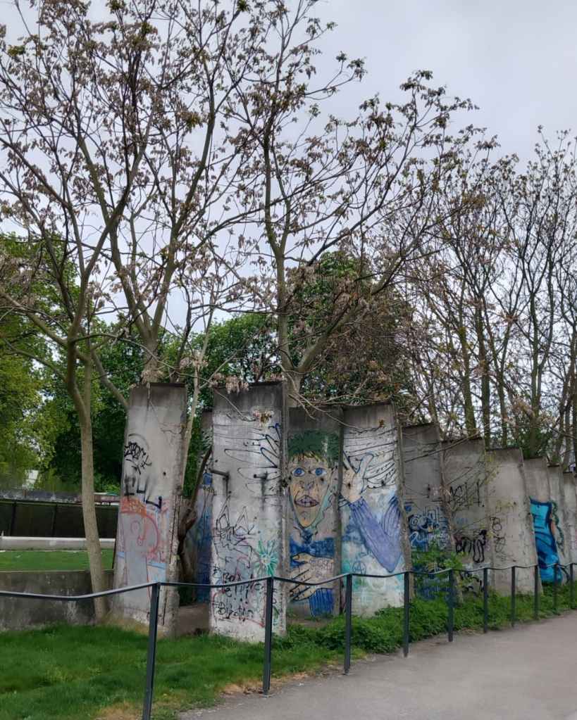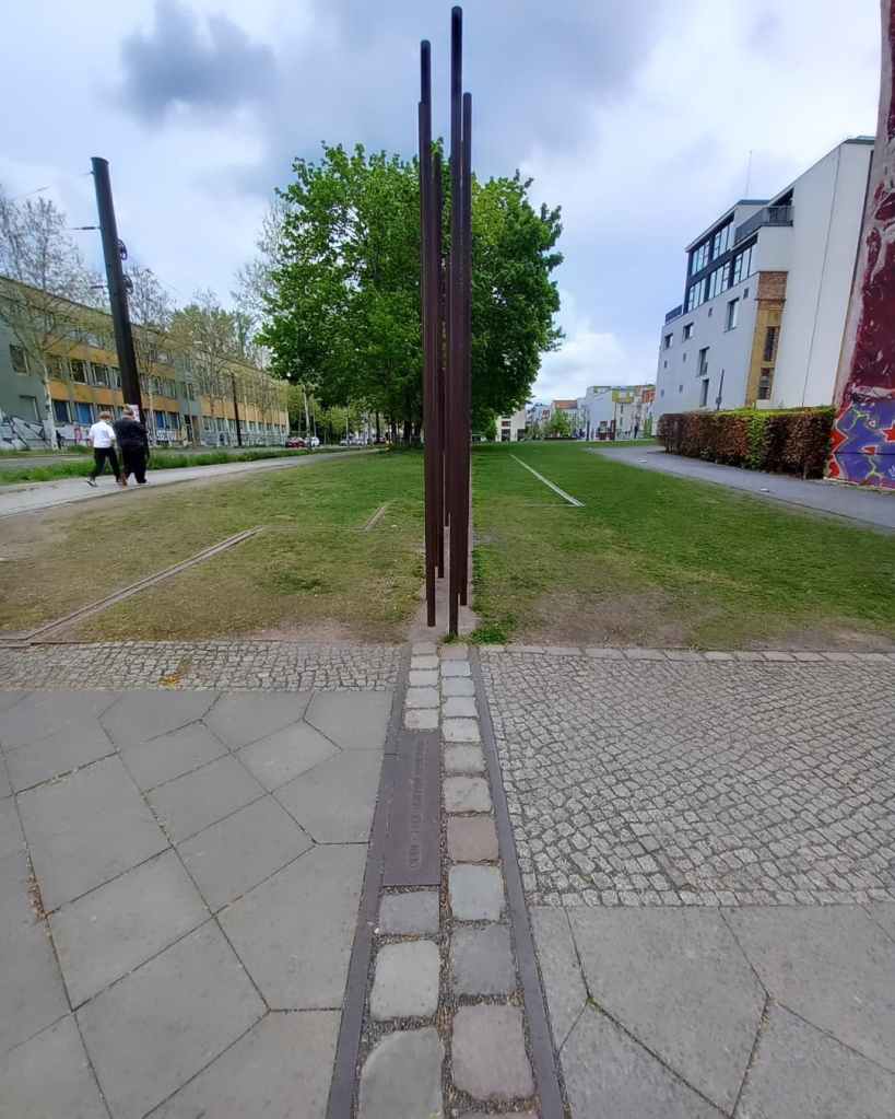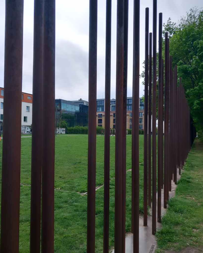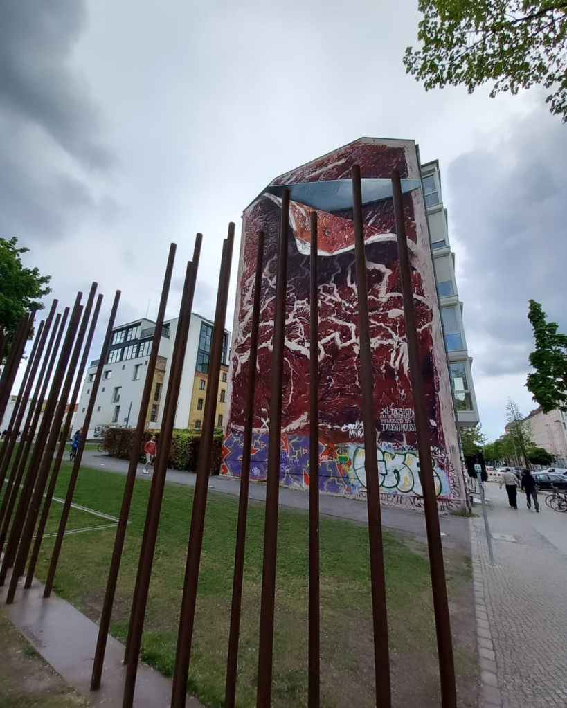 Mes pieds parlent à la place de ma tête et me voilà rapidement à zigzaguer sur Bernaueur Straße, souvent à rebours, entre les longues tiges de fer rouillées, représentation imagée et parlante du mur qui enferma les gens à l’Est. Jusqu’à finalement me trouver au pied du mur, de la dernière version du mur, la seule qui fut conservée.