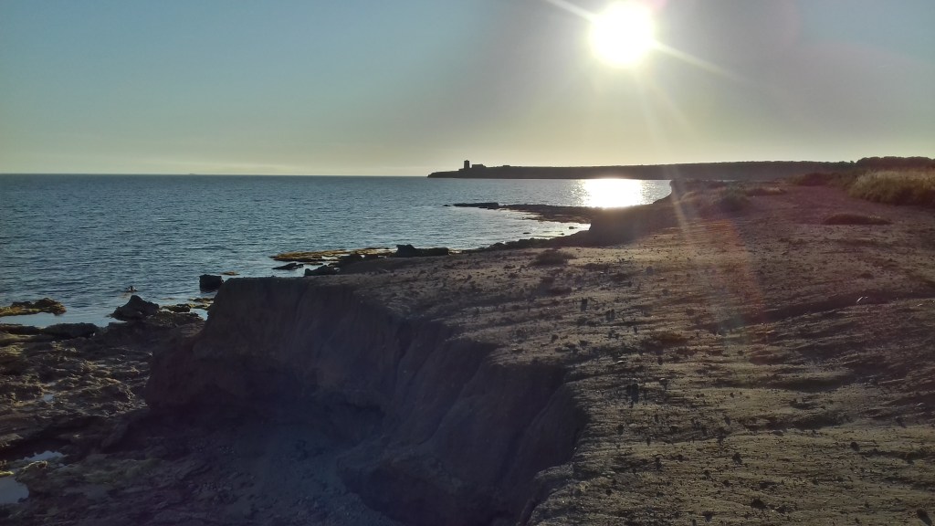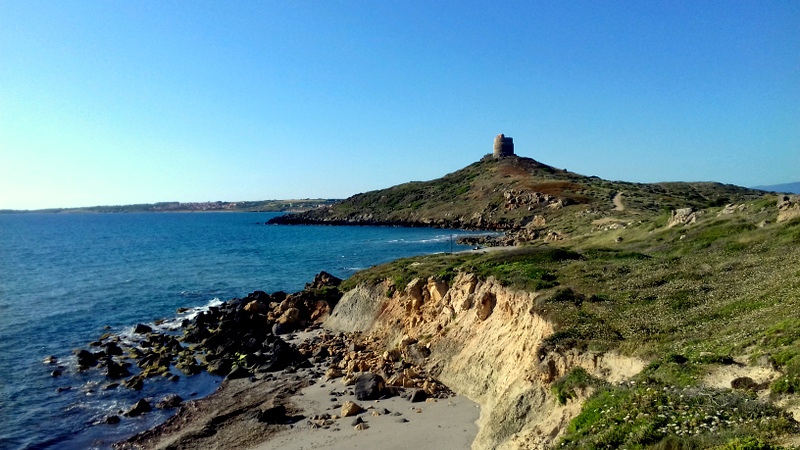 La voie principale de l’ancien port phénicien de Tharros se déroule alors sous nos pieds intéressés pour nous conduire à une langue de terre pelée, marécageuse et aujourd’hui inhabitée, dernier rempart de la péninsule de Sinis. Les Phénicens se sont installés sur cet ancien site nuragique aux alentours de 900-800 av. JC. parce que l’endroit était facilement défendable et bénéficiait d’un mouillage protégé. La ville est abandonnée vers 1070, lorsque les habitants migrent vers la nouvelle ville d’Oristano, et ses ruines qui ont gagné contre la montée des eaux sont toujours là pour nous raconter l’histoire de l’Ancien Monde. Une tour s’élève en haut des colonnes phéniciennes ébréchées et regarde de chaque côté de la mer pour protéger les biens marchands de la ville abandonnée. Cependant, comme au Black Fort irlandais, ce ne sont pas tant les ruines de la ville commerciale qui importent, ce sont les bouleversants paysages qui plongent dans la mer à ses côtés. Nous prenons les sentiers tracés mais plus caillouteux de cette terre mangée par les vagues alors que le soleil est à sa parfaite place dans sa course. Ni trop haut, ni trop près de l’horizon, il est tendre et venteux pour accompagner nos jambes échauffées, il fait de l’ombre à la pierre en forme de cœur qui surgit impromptement devant nos chaussures. Nous longeons la terre si près de la mer, le bruit des vagues est devenue notre habitude quand soudain le silence est notre seule musique, j’entends mon souffle chaud, j’entends mes pas secs sur le sol dur. Nous sommes en haut du promontoire et la mer n’est plus qu’une étendue bleue, brillante au soleil, mais calme et silencieuse. On voit le Nord que l’on a parcouru ces jours derniers, on découvre le Sud que l’on n’explorera pas demain, ni après-demain. On domine une toute petite partie du monde, car la force de la marche donne toujours cette sensation incroyable de posséder une infime partie de notre planète pour une infime seconde.