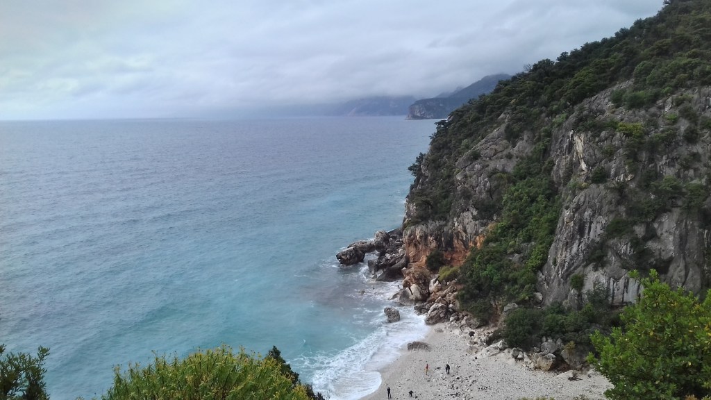 Nous retrouvons tout de même, pendant quelques minutes, notre Sardaigne sauvage que le brouillard jaloux nous dissimule depuis deux jours. Nous sommes au bord de la Caletta Fuili, apercevant dans le flou de la houle, les monts de la Supramonte qui plonge à pic sur la mer. La plage est belle, vierge en ce jour de gris, un peu semblable aux plages sauvages du Pacifique. Ce plaisir éphémère nous échappe trop vite, poursuivies par la police italienne pour une kangoo rouge mal garée.