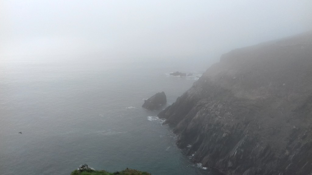 La lumière de la péninsule prend très rapidement une teinte blanche, engourdie de son brouillard mouvant. Tous les monts qui m’entourent sont couverts d’une fausse neige effervescente. Je marche des kilomètres dans la brume désertique, du Sud au Nord, de l’Est à l’Ouest. Confiante et à la merci du destin, je regarde les vallées s’emplir de nuées alors que les monts brillent du soleil matinal. Je suis éblouie par les baies jumelles et leurs mouettes ; puis, je ne vois plus rien. Je domine les étendues aveugles. J’entends avant de le voir, l’océan battre les flancs de Slea Head. Tout est tellement triste et presque mortifère dans ce brouillard gris.
