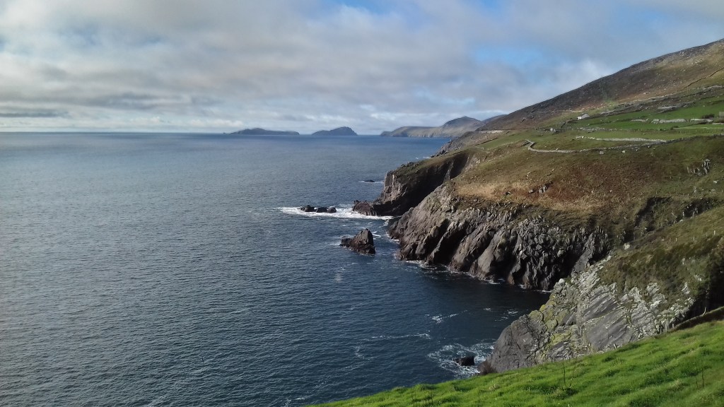 Le temps de rémpaqueter tous mes trésors de voyageuse, je m’en vais planter mes rêves sur la Péninsule de Dingle pendant quelques jours. Sur le chemin côtier de Killarney à Dingle, je m’éblouis de la lumière qui transperce les nuages pour regarder l’océan latent et lointain, je contemple les monts côtiers qui font de l’ombre à l’eau placide de la baie. Je suis bienheureuse d’avoir attendu le calme hivernal pour rencontrer cette péninsule multiple et toujours visitée, mais heureusement et absolument désertique en cette basse saison.